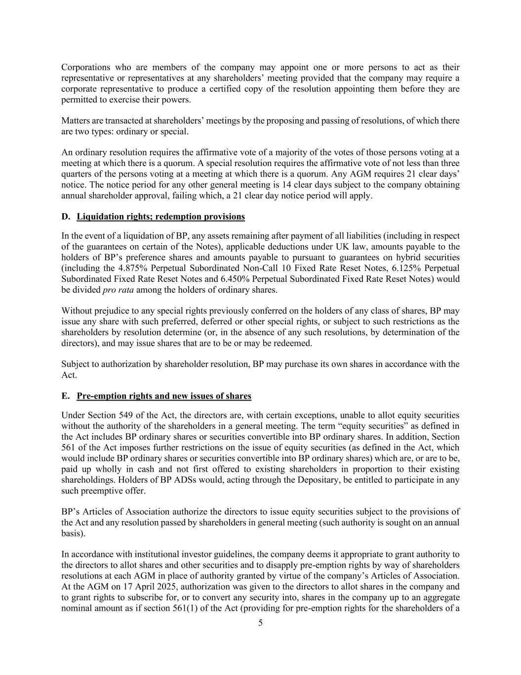 5 Corporations who are members of the company may appoint one or more persons to act as their representative or representatives at any shareholders’ meeting provided that the company may require a corporate representative to produce a certified copy of the resolution appointing them before they are permitted to exercise their powers. Matters are transacted at shareholders’ meetings by the proposing and passing of resolutions, of which there are two types: ordinary or special. An ordinary resolution requires the affirmative vote of a majority of the votes of those persons voting at a meeting at which there is a quorum. A special resolution requires the affirmative vote of not less than three quarters of the persons voting at a meeting at which there is a quorum. Any AGM requires 21 clear days’ notice. The notice period for any other general meeting is 14 clear days subject to the company obtaining annual shareholder approval, failing which, a 21 clear day notice period will apply. D. Liquidation rights; redemption provisions In the event of a liquidation of BP, any assets remaining after payment of all liabilities (including in respect of the guarantees on certain of the Notes), applicable deductions under UK law, amounts payable to the holders of BP’s preference shares and amounts payable to pursuant to guarantees on hybrid securities (including the 4.875% Perpetual Subordinated Non-Call 10 Fixed Rate Reset Notes, 6.125% Perpetual Subordinated Fixed Rate Reset Notes and 6.450% Perpetual Subordinated Fixed Rate Reset Notes) would be divided pro rata among the holders of ordinary shares. Without prejudice to any special rights previously conferred on the holders of any class of shares, BP may issue any share with such preferred, deferred or other special rights, or subject to such restrictions as the shareholders by resolution determine (or, in the absence of any such resolutions, by determination of the directors), and may issue shares that are to be or may be redeemed. Subject to authorization by shareholder resolution, BP may purchase its own shares in accordance with the Act. E. Pre-emption rights and new issues of shares Under Section 549 of the Act, the directors are, with certain exceptions, unable to allot equity securities without the authority of the shareholders in a general meeting. The term “equity securities” as defined in the Act includes BP ordinary shares or securities convertible into BP ordinary shares. In addition, Section 561 of the Act imposes further restrictions on the issue of equity securities (as defined in the Act, which would include BP ordinary shares or securities convertible into BP ordinary shares) which are, or are to be, paid up wholly in cash and not first offered to existing shareholders in proportion to their existing shareholdings. Holders of BP ADSs would, acting through the Depositary, be entitled to participate in any such preemptive offer. BP’s Articles of Association authorize the directors to issue equity securities subject to the provisions of the Act and any resolution passed by shareholders in general meeting (such authority is sought on an annual basis). In accordance with institutional investor guidelines, the company deems it appropriate to grant authority to the directors to allot shares and other securities and to disapply pre-emption rights by way of shareholders resolutions at each AGM in place of authority granted by virtue of the company’s Articles of Association. At the AGM on 17 April 2025, authorization was given to the directors to allot shares in the company and to grant rights to subscribe for, or to convert any security into, shares in the company up to an aggregate nominal amount as if section 561(1) of the Act (providing for pre-emption rights for the shareholders of a