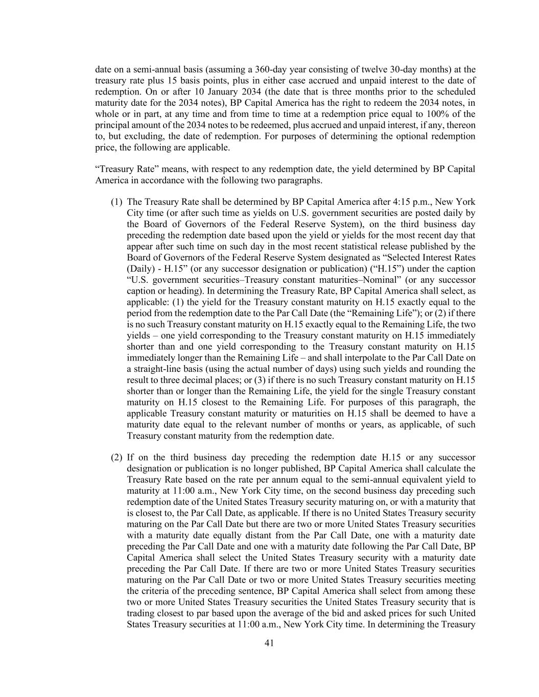 41 date on a semi-annual basis (assuming a 360-day year consisting of twelve 30-day months) at the treasury rate plus 15 basis points, plus in either case accrued and unpaid interest to the date of redemption. On or after 10 January 2034 (the date that is three months prior to the scheduled maturity date for the 2034 notes), BP Capital America has the right to redeem the 2034 notes, in whole or in part, at any time and from time to time at a redemption price equal to 100% of the principal amount of the 2034 notes to be redeemed, plus accrued and unpaid interest, if any, thereon to, but excluding, the date of redemption. For purposes of determining the optional redemption price, the following are applicable. “Treasury Rate” means, with respect to any redemption date, the yield determined by BP Capital America in accordance with the following two paragraphs. (1) The Treasury Rate shall be determined by BP Capital America after 4:15 p.m., New York City time (or after such time as yields on U.S. government securities are posted daily by the Board of Governors of the Federal Reserve System), on the third business day preceding the redemption date based upon the yield or yields for the most recent day that appear after such time on such day in the most recent statistical release published by the Board of Governors of the Federal Reserve System designated as “Selected Interest Rates (Daily) - H.15” (or any successor designation or publication) (“H.15”) under the caption “U.S. government securities–Treasury constant maturities–Nominal” (or any successor caption or heading). In determining the Treasury Rate, BP Capital America shall select, as applicable: (1) the yield for the Treasury constant maturity on H.15 exactly equal to the period from the redemption date to the Par Call Date (the “Remaining Life”); or (2) if there is no such Treasury constant maturity on H.15 exactly equal to the Remaining Life, the two yields – one yield corresponding to the Treasury constant maturity on H.15 immediately shorter than and one yield corresponding to the Treasury constant maturity on H.15 immediately longer than the Remaining Life – and shall interpolate to the Par Call Date on a straight-line basis (using the actual number of days) using such yields and rounding the result to three decimal places; or (3) if there is no such Treasury constant maturity on H.15 shorter than or longer than the Remaining Life, the yield for the single Treasury constant maturity on H.15 closest to the Remaining Life. For purposes of this paragraph, the applicable Treasury constant maturity or maturities on H.15 shall be deemed to have a maturity date equal to the relevant number of months or years, as applicable, of such Treasury constant maturity from the redemption date. (2) If on the third business day preceding the redemption date H.15 or any successor designation or publication is no longer published, BP Capital America shall calculate the Treasury Rate based on the rate per annum equal to the semi-annual equivalent yield to maturity at 11:00 a.m., New York City time, on the second business day preceding such redemption date of the United States Treasury security maturing on, or with a maturity that is closest to, the Par Call Date, as applicable. If there is no United States Treasury security maturing on the Par Call Date but there are two or more United States Treasury securities with a maturity date equally distant from the Par Call Date, one with a maturity date preceding the Par Call Date and one with a maturity date following the Par Call Date, BP Capital America shall select the United States Treasury security with a maturity date preceding the Par Call Date. If there are two or more United States Treasury securities maturing on the Par Call Date or two or more United States Treasury securities meeting the criteria of the preceding sentence, BP Capital America shall select from among these two or more United States Treasury securities the United States Treasury security that is trading closest to par based upon the average of the bid and asked prices for such United States Treasury securities at 11:00 a.m., New York City time. In determining the Treasury