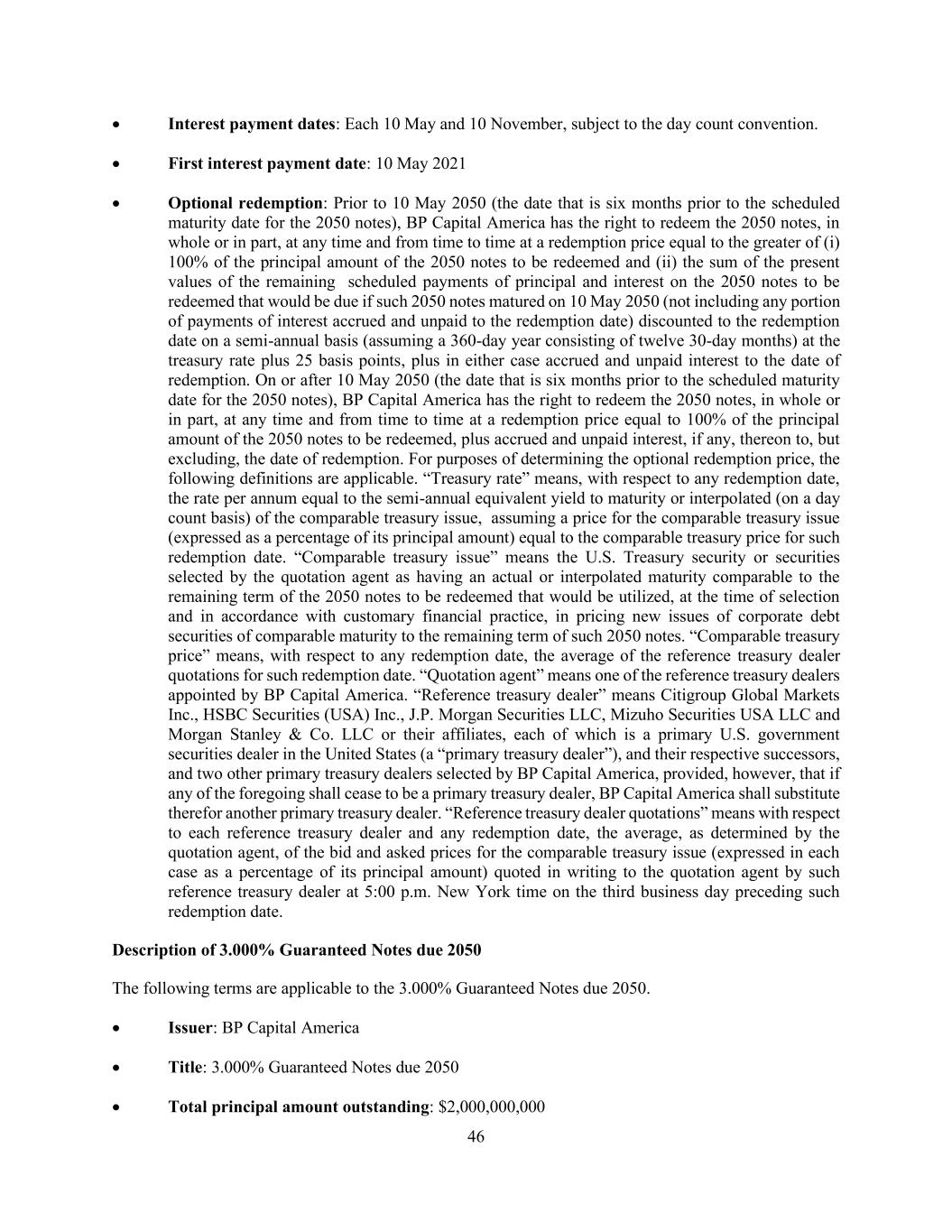45 the present values of the remaining scheduled payments of principal and interest on the 2041 notes to be redeemed that would be due if such notes matured on 17 December 2040 (not including any portion of payments of interest accrued and unpaid to the redemption date) discounted to the redemption date on a semi-annual basis (assuming a 360-day year consisting of twelve 30-day months) at the treasury rate plus 15 basis points, plus in either case accrued and unpaid interest to the date of redemption. On or after 17 December 2040 (the date that is six months prior to the scheduled maturity date for the 2041 notes), BP Capital America has the right to redeem the 2041 notes, in whole or in part, at any time and from time to time at a redemption price equal to 100% of the principal amount of the 2041 notes to be redeemed, plus accrued and unpaid interest, if any, thereon to, but excluding, the date of redemption. For purposes of determining the optional redemption price, the following definitions are applicable. “Treasury rate” means, with respect to any redemption date, the rate per annum equal to the semi-annual equivalent yield to maturity or interpolated (on a day count basis) of the comparable treasury issue, assuming a price for the comparable treasury issue (expressed as a percentage of its principal amount) equal to the comparable treasury price for such redemption date. “Comparable treasury issue” means the U.S. Treasury security or securities selected by the quotation agent as having an actual or interpolated maturity comparable to the remaining term of the 2041 notes to be redeemed that would be utilized, at the time of selection and in accordance with customary financial practice, in pricing new issues of corporate debt securities of comparable maturity to the remaining term of such notes. “Comparable treasury price” means, with respect to any redemption date, the average of the reference treasury dealer quotations for such redemption date. “Quotation agent” means one of the reference treasury dealers appointed by BP Capital America. “Reference treasury dealer” means one of BofA Securities, Inc., Citigroup Global Markets Inc., Mizuho Securities USA LLC, Morgan Stanley & Co. LLC, SG Americas Securities, LLC or Wells Fargo Securities, LLC or one of their affiliates, which is a primary U.S. government securities dealer in the United States (a “primary treasury dealer”), and their respective successors, and two other primary treasury dealers selected by BP Capital America, provided, however, that if any of the foregoing shall cease to be a primary treasury dealer, BP Capital America shall substitute therefor another primary treasury dealer. “Reference treasury dealer quotations” means with respect to each reference treasury dealer and any redemption date, the average, as determined by the quotation agent, of the bid and asked prices for the comparable treasury issue (expressed in each case as a percentage of its principal amount) quoted in writing to the quotation agent by such reference treasury dealer at 5:00 p.m. New York time on the third business day preceding such redemption date. Description of 2.772% Guaranteed Notes due 2050 The following terms are applicable to the 2.772% Guaranteed Notes due 2050. • Issuer: BP Capital America • Title: 2.772% Guaranteed Notes due 2050 • Total principal amount outstanding: $1,500,000,000 • Issuance date: 10 August 2020 • Maturity date: 10 November 2050 • Interest rate: 2.772% per annum • Date interest starts accruing: 10 August 2020