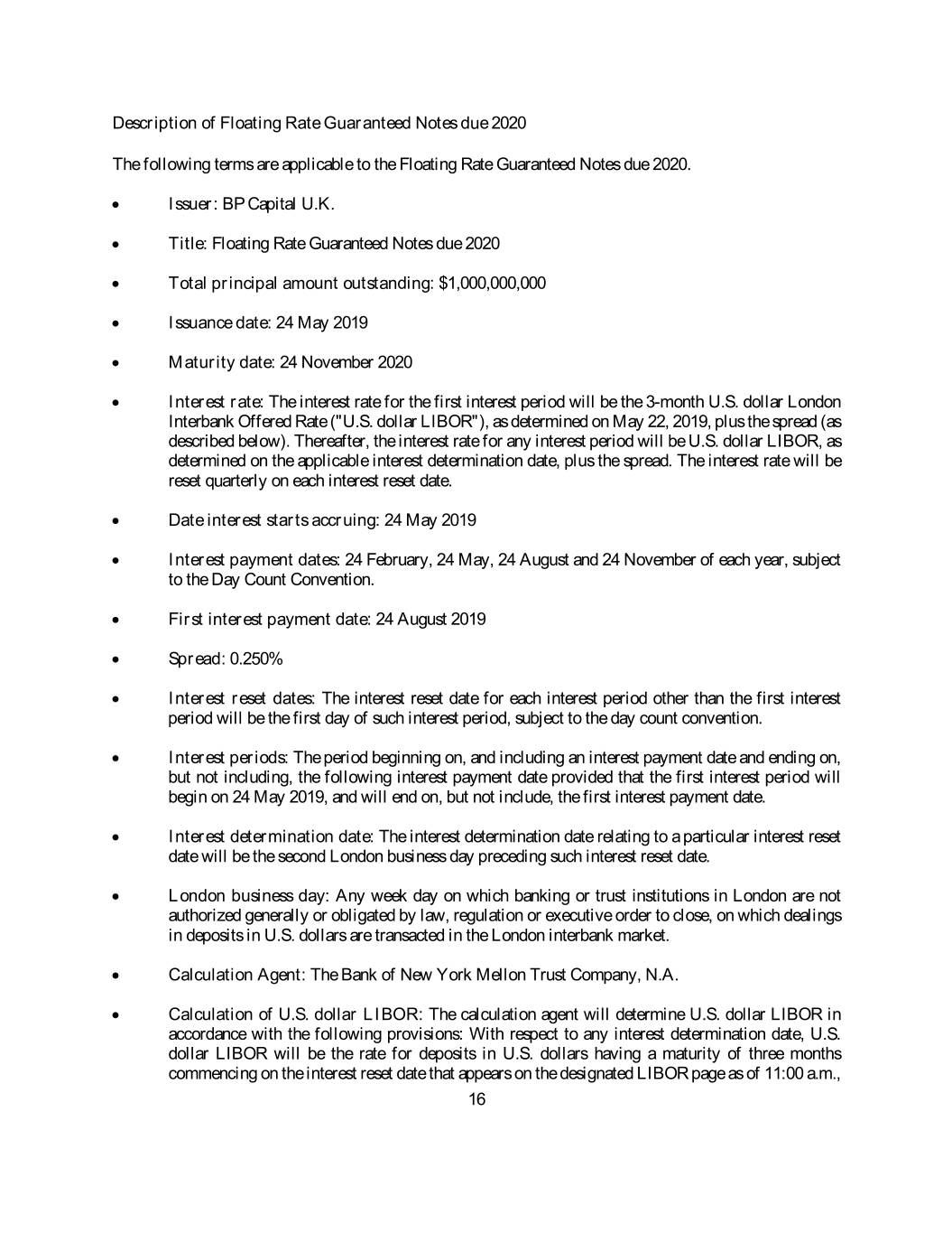 Description of Floating Rate Guaranteed Notes due 2020 The following terms are applicable to the Floating Rate Guaranteed Notes due 2020. • Issuer: BP Capital U.K. • Title: Floating Rate Guaranteed Notes due 2020 • Total principal amount outstanding: $1,000,000,000 • Issuance date: 24 May 2019 • Maturity date: 24 November 2020 • Interest rate: The interest rate for the first interest period will be the 3-month U.S. dollar London Interbank Offered Rate ("U.S. dollar LIBOR"), as determined on May 22, 2019, plus the spread (as described below). Thereafter, the interest rate for any interest period will be U.S. dollar LIBOR, as determined on the applicable interest determination date, plus the spread. The interest rate will be reset quarterly on each interest reset date. • Date interest starts accruing: 24 May 2019 • Interest payment dates: 24 February, 24 May, 24 August and 24 November of each year, subject to the Day Count Convention. • First interest payment date: 24 August 2019 • Spread: 0.250% • Interest reset dates: The interest reset date for each interest period other than the first interest period will be the first day of such interest period, subject to the day count convention. • Interest periods: The period beginning on, and including an interest payment date and ending on, but not including, the following interest payment date provided that the first interest period will begin on 24 May 2019, and will end on, but not include, the first interest payment date. • Interest determination date: The interest determination date relating to a particular interest reset date will be the second London business day preceding such interest reset date. • London business day: Any week day on which banking or trust institutions in London are not authorized generally or obligated by law, regulation or executive order to close, on which dealings in deposits in U.S. dollars are transacted in the London interbank market. • Calculation Agent: The Bank of New York Mellon Trust Company, N.A. • Calculation of U.S. dollar LIBOR: The calculation agent will determine U.S. dollar LIBOR in accordance with the following provisions: With respect to any interest determination date, U.S. dollar LIBOR will be the rate for deposits in U.S. dollars having a maturity of three months commencing on the interest reset date that appears on the designated LIBOR page as of 11:00 a.m., 16