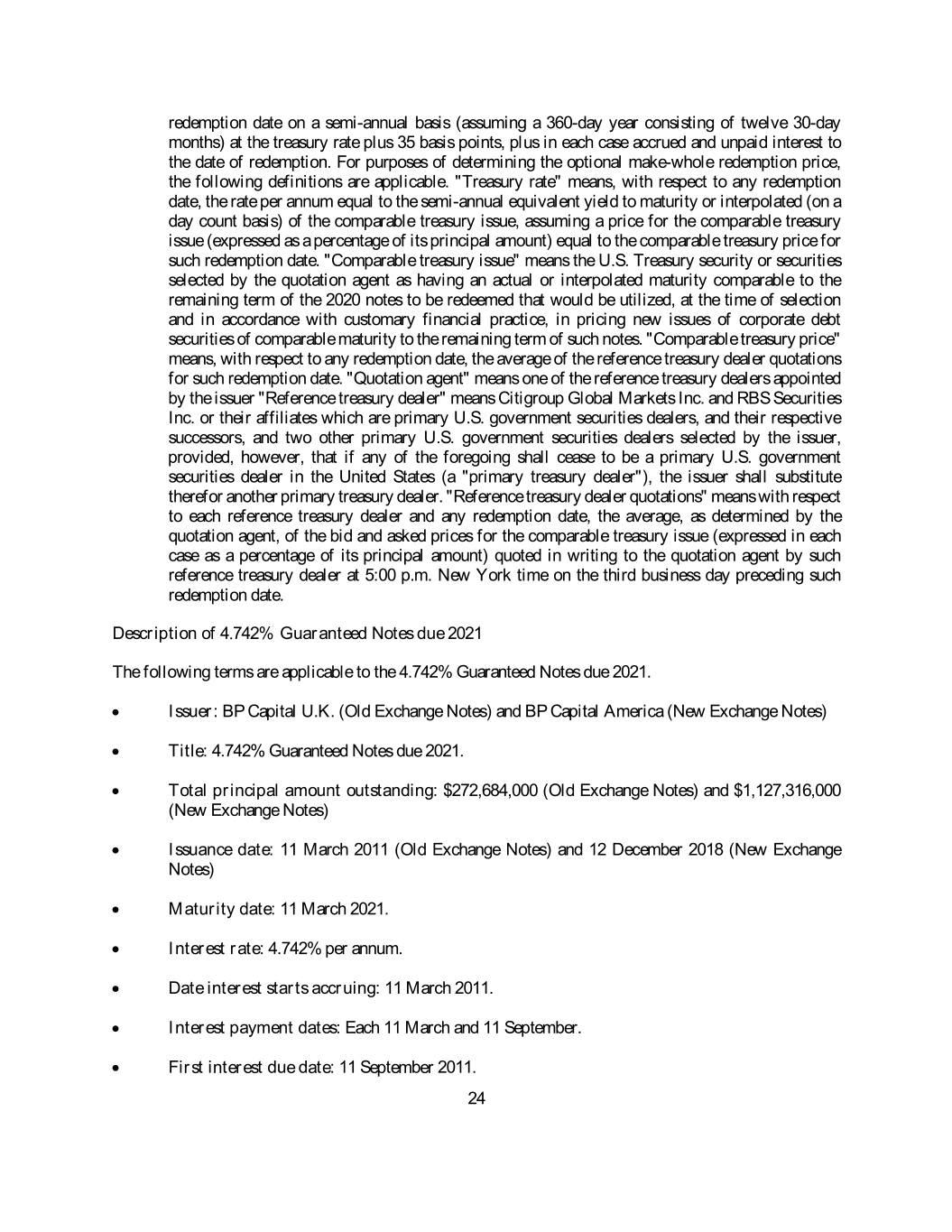 redemption date on a semi-annual basis (assuming a 360-day year consisting of twelve 30-day months) at the treasury rate plus 35 basis points, plus in each case accrued and unpaid interest to the date of redemption. For purposes of determining the optional make-whole redemption price, the following definitions are applicable. "Treasury rate" means, with respect to any redemption date, the rate per annum equal to the semi-annual equivalent yield to maturity or interpolated (on a day count basis) of the comparable treasury issue, assuming a price for the comparable treasury issue (expressed as a percentage of its principal amount) equal to the comparable treasury price for such redemption date. "Comparable treasury issue" means the U.S. Treasury security or securities selected by the quotation agent as having an actual or interpolated maturity comparable to the remaining term of the 2020 notes to be redeemed that would be utilized, at the time of selection and in accordance with customary financial practice, in pricing new issues of corporate debt securities of comparable maturity to the remaining term of such notes. "Comparable treasury price" means, with respect to any redemption date, the average of the reference treasury dealer quotations for such redemption date. "Quotation agent" means one of the reference treasury dealers appointed by the issuer "Reference treasury dealer" means Citigroup Global Markets Inc. and RBS Securities Inc. or their affiliates which are primary U.S. government securities dealers, and their respective successors, and two other primary U.S. government securities dealers selected by the issuer, provided, however, that if any of the foregoing shall cease to be a primary U.S. government securities dealer in the United States (a "primary treasury dealer"), the issuer shall substitute therefor another primary treasury dealer. "Reference treasury dealer quotations" means with respect to each reference treasury dealer and any redemption date, the average, as determined by the quotation agent, of the bid and asked prices for the comparable treasury issue (expressed in each case as a percentage of its principal amount) quoted in writing to the quotation agent by such reference treasury dealer at 5:00 p.m. New York time on the third business day preceding such redemption date. Description of 4.742% Guaranteed Notes due 2021 The following terms are applicable to the 4.742% Guaranteed Notes due 2021. • Issuer: BP Capital U.K. (Old Exchange Notes) and BP Capital America (New Exchange Notes) • Title: 4.742% Guaranteed Notes due 2021. • Total principal amount outstanding: $272,684,000 (Old Exchange Notes) and $1,127,316,000 (New Exchange Notes) • Issuance date: 11 March 2011 (Old Exchange Notes) and 12 December 2018 (New Exchange Notes) • Maturity date: 11 March 2021. • Interest rate: 4.742% per annum. • Date interest starts accruing: 11 March 2011. • Interest payment dates: Each 11 March and 11 September. • First interest due date: 11 September 2011. 24