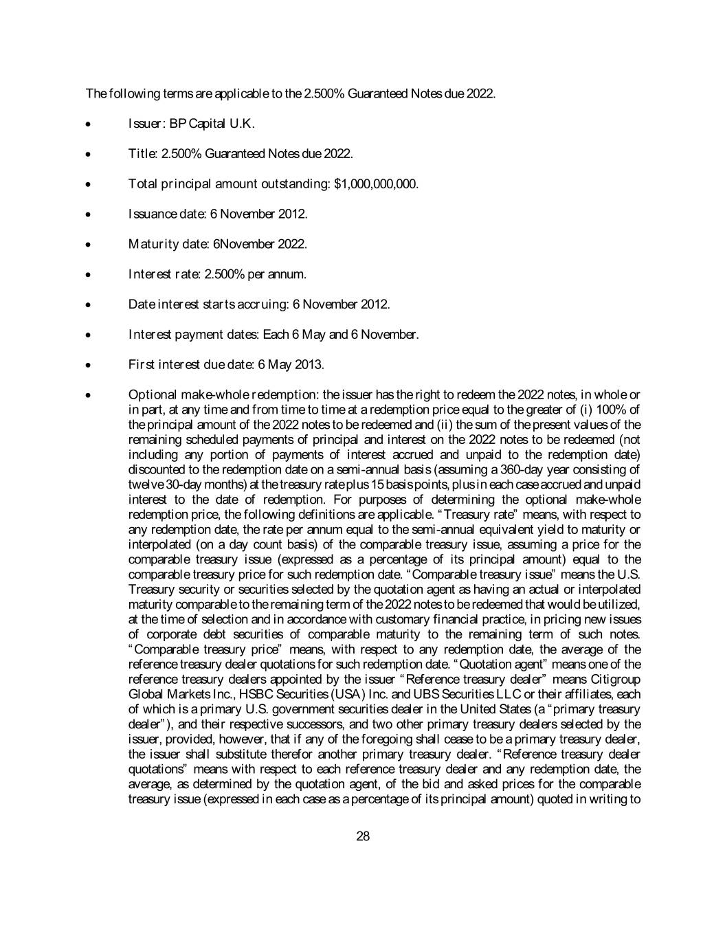 dealer, the issuer shall substitute therefore another primary treasury dealer. “Reference treasury dealer quotations” means with respect to each reference treasury dealer and any redemption date, the average, as determined by the quotation agent, of the bid and asked prices for the comparable treasury issue (expressed in each case as a percentage of its principal amount) quoted in writing to the quotation agent by such reference treasury dealer at 5:00 p.m. New York time on the third business day preceding such redemption date. Description of 3.723% Guaranteed Notes due 2028 The following terms are applicable to the 3.723% Guaranteed Notes due 2028. • Issuer: BP Capital U.K. • Title: 3.723% Guaranteed Notes due 2028 • Total principal amount outstanding: $800,000,000 • Issuance date: 28 November 2016 • Maturity date: 28 November 2028 • Interest rate: 3.723% per annum • Date interest starts accruing: 28 November 2016 • Interest payment dates: Each 28 May and 28 November, subject to the day count convention. • First interest payment date: 28 May 2017 • Optional redemption: Prior to 28 August 2028 (the date that is three months prior to the scheduled maturity date for the 2028 notes), the issuer has the right to redeem the 2028 notes, in whole or in part, at any time and from time to time at a redemption price equal to the greater of (i) 100% of the principal amount of the 2028 notes to be redeemed and (ii) the sum of the present values of the remaining scheduled payments of principal and interest on the 2028 notes to be redeemed that would be due if such notes matured on 28 August 2028 (not including any portion of payments of interest accrued and unpaid to the redemption date) discounted to the redemption date on a semiannual basis (assuming a 360-day year consisting of twelve 30-day months) at the treasury rate plus 25 basis points, plus in each case accrued and unpaid interest to the date of redemption. On or after 28 August 2028 (the date that is three months prior to the scheduled maturity date for the 2028 notes), the issuer has the right to redeem the 2028 notes, in whole or in part, at any time and from time to time at a redemption price equal to 100% of the principal amount of the 2028 notes to be redeemed, plus accrued and unpaid interest, if any, thereon to, but excluding, the date of redemption. For purposes of determining the optional redemption price, the following definitions are applicable. “Treasury rate” means, with respect to any redemption date, the rate per annum equal to the semi-annual equivalent yield to maturity or interpolated (on a day count basis) of the comparable treasury issue, assuming a price for the comparable treasury issue (expressed as a percentage of its principal amount) equal to the comparable treasury price for such redemption date. “Comparable treasury issue” means the U.S. Treasury security or securities selected by the quotation agent as having an actual or interpolated maturity comparable to the remaining term of 49