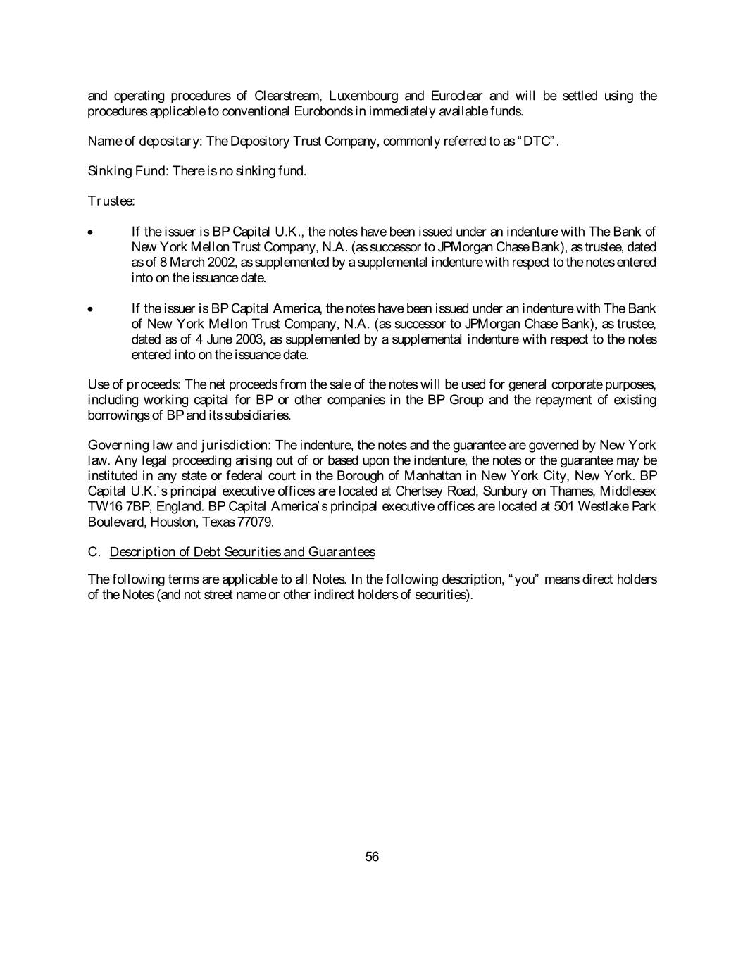 and operating procedures of Clearstream, Luxembourg and Euroclear and will be settled using the procedures applicable to conventional Eurobonds in immediately available funds. Name of depositary: The Depository Trust Company, commonly referred to as “DTC”. Sinking Fund: There is no sinking fund. Trustee: • If the issuer is BP Capital U.K., the notes have been issued under an indenture with The Bank of New York Mellon Trust Company, N.A. (as successor to JPMorgan Chase Bank), as trustee, dated as of 8 March 2002, as supplemented by a supplemental indenture with respect to the notes entered into on the issuance date. • If the issuer is BP Capital America, the notes have been issued under an indenture with The Bank of New York Mellon Trust Company, N.A. (as successor to JPMorgan Chase Bank), as trustee, dated as of 4 June 2003, as supplemented by a supplemental indenture with respect to the notes entered into on the issuance date. Use of proceeds: The net proceeds from the sale of the notes will be used for general corporate purposes, including working capital for BP or other companies in the BP Group and the repayment of existing borrowings of BP and its subsidiaries. Governing law and jurisdiction: The indenture, the notes and the guarantee are governed by New York law. Any legal proceeding arising out of or based upon the indenture, the notes or the guarantee may be instituted in any state or federal court in the Borough of Manhattan in New York City, New York. BP Capital U.K.’s principal executive offices are located at Chertsey Road, Sunbury on Thames, Middlesex TW16 7BP, England. BP Capital America’s principal executive offices are located at 501 Westlake Park Boulevard, Houston, Texas 77079. C. Description of Debt Securities and Guarantees The following terms are applicable to all Notes. In the following description, “you” means direct holders of the Notes (and not street name or other indirect holders of securities). 56