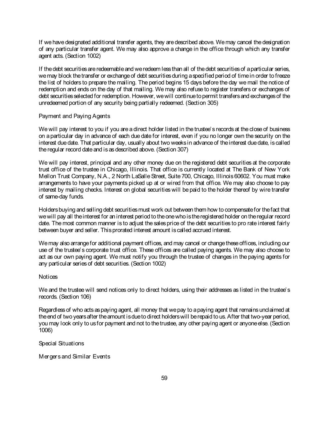 If we have designated additional transfer agents, they are described above. We may cancel the designation of any particular transfer agent. We may also approve a change in the office through which any transfer agent acts. (Section 1002) If the debt securities are redeemable and we redeem less than all of the debt securities of a particular series, we may block the transfer or exchange of debt securities during a specified period of time in order to freeze the list of holders to prepare the mailing. The period begins 15 days before the day we mail the notice of redemption and ends on the day of that mailing. We may also refuse to register transfers or exchanges of debt securities selected for redemption. However, we will continue to permit transfers and exchanges of the unredeemed portion of any security being partially redeemed. (Section 305) Payment and Paying Agents We will pay interest to you if you are a direct holder listed in the trustee’s records at the close of business on a particular day in advance of each due date for interest, even if you no longer own the security on the interest due date. That particular day, usually about two weeks in advance of the interest due date, is called the regular record date and is as described above. (Section 307) We will pay interest, principal and any other money due on the registered debt securities at the corporate trust office of the trustee in Chicago, Illinois. That office is currently located at The Bank of New York Mellon Trust Company, N.A., 2 North LaSalle Street, Suite 700, Chicago, Illinois 60602. You must make arrangements to have your payments picked up at or wired from that office. We may also choose to pay interest by mailing checks. Interest on global securities will be paid to the holder thereof by wire transfer of sameday funds. Holders buying and selling debt securities must work out between them how to compensate for the fact that we will pay all the interest for an interest period to the one who is the registered holder on the regular record date. The most common manner is to adjust the sales price of the debt securities to pro rate interest fairly between buyer and seller. This prorated interest amount is called accrued interest. We may also arrange for additional payment offices, and may cancel or change these offices, including our use of the trustee’s corporate trust office. These offices are called paying agents. We may also choose to act as our own paying agent. We must notify you through the trustee of changes in the paying agents for any particular series of debt securities. (Section 1002) Notices We and the trustee will send notices only to direct holders, using their addresses as listed in the trustee’s records. (Section 106) Regardless of who acts as paying agent, all money that we pay to a paying agent that remains unclaimed at the end of two years after the amount is due to direct holders will be repaid to us. After that twoyear period, you may look only to us for payment and not to the trustee, any other paying agent or anyone else. (Section 1006) Special Situations Mergers and Similar Events 59