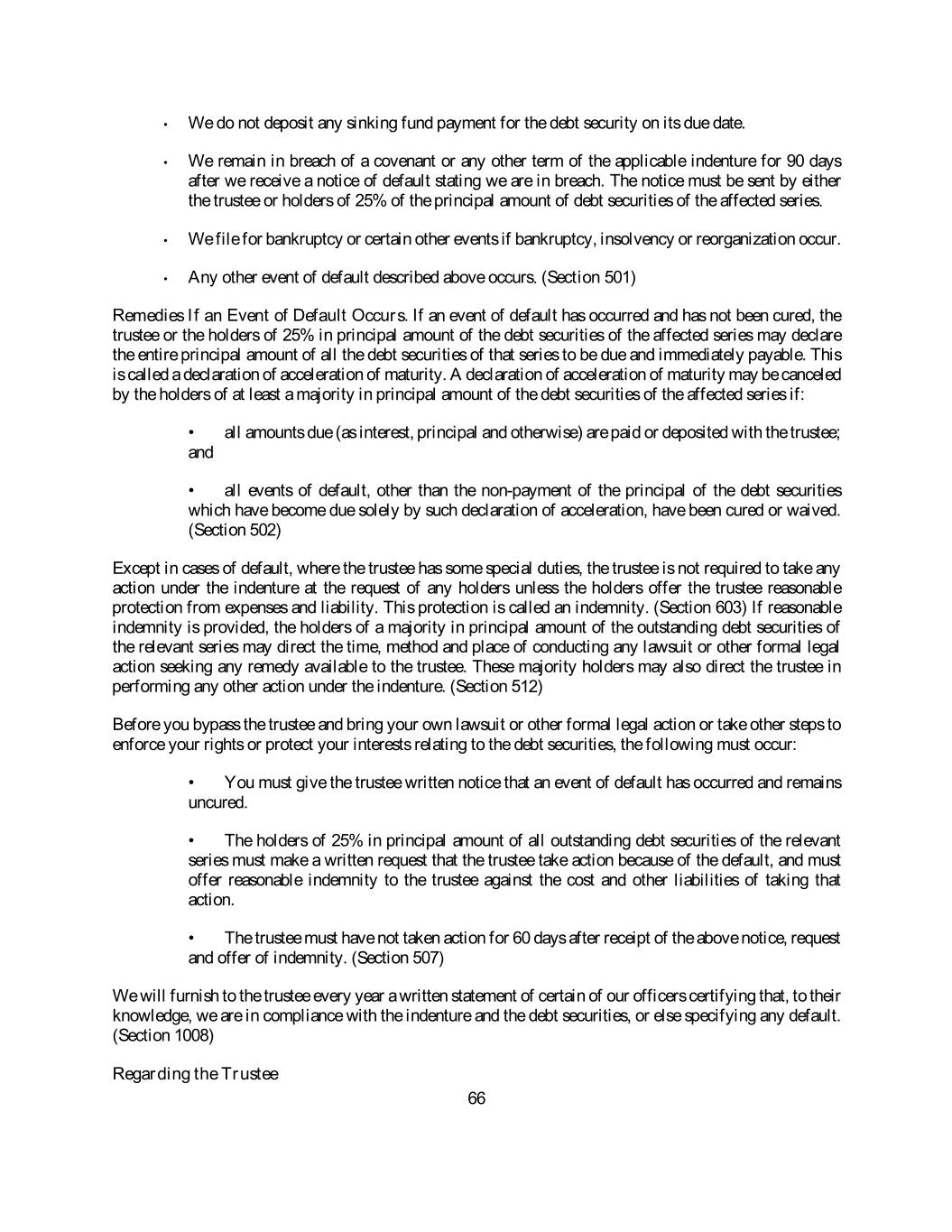 • We do not deposit any sinking fund payment for the debt security on its due date. • We remain in breach of a covenant or any other term of the applicable indenture for 90 days after we receive a notice of default stating we are in breach. The notice must be sent by either the trustee or holders of 25% of the principal amount of debt securities of the affected series. • We file for bankruptcy or certain other events if bankruptcy, insolvency or reorganization occur. • Any other event of default described above occurs. (Section 501) Remedies If an Event of Default Occurs. If an event of default has occurred and has not been cured, the trustee or the holders of 25% in principal amount of the debt securities of the affected series may declare the entire principal amount of all the debt securities of that series to be due and immediately payable. This is called a declaration of acceleration of maturity. A declaration of acceleration of maturity may be canceled by the holders of at least a majority in principal amount of the debt securities of the affected series if: • all amounts due (as interest, principal and otherwise) are paid or deposited with the trustee; and • all events of default, other than the nonpayment of the principal of the debt securities which have become due solely by such declaration of acceleration, have been cured or waived. (Section 502) Except in cases of default, where the trustee has some special duties, the trustee is not required to take any action under the indenture at the request of any holders unless the holders offer the trustee reasonable protection from expenses and liability. This protection is called an indemnity. (Section 603) If reasonable indemnity is provided, the holders of a majority in principal amount of the outstanding debt securities of the relevant series may direct the time, method and place of conducting any lawsuit or other formal legal action seeking any remedy available to the trustee. These majority holders may also direct the trustee in performing any other action under the indenture. (Section 512) Before you bypass the trustee and bring your own lawsuit or other formal legal action or take other steps to enforce your rights or protect your interests relating to the debt securities, the following must occur: • You must give the trustee written notice that an event of default has occurred and remains uncured. • The holders of 25% in principal amount of all outstanding debt securities of the relevant series must make a written request that the trustee take action because of the default, and must offer reasonable indemnity to the trustee against the cost and other liabilities of taking that action. • The trustee must have not taken action for 60 days after receipt of the above notice, request and offer of indemnity. (Section 507) We will furnish to the trustee every year a written statement of certain of our officers certifying that, to their knowledge, we are in compliance with the indenture and the debt securities, or else specifying any default. (Section 1008) Regarding the Trustee 66