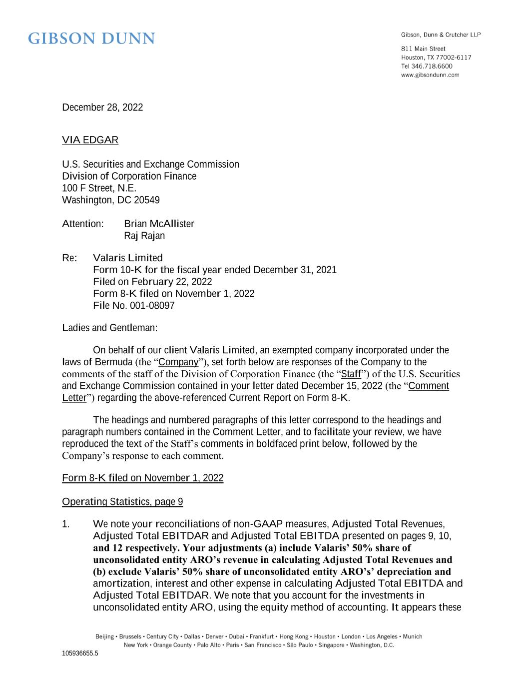 105936655.5 December 28, 2022 VIA EDGAR U.S. Securities and Exchange Commission Division of Corporation Finance 100 F Street, N.E. Washington, DC 20549 Attention: Brian McAllister Raj Rajan Re: Valaris Limited Form 10-K for the fiscal year ended December 31, 2021 Filed on February 22, 2022 Form 8-K filed on November 1, 2022 File No. 001-08097 Ladies and Gentleman: On behalf of our client Valaris Limited, an exempted company incorporated under the laws of Bermuda (the “Company”), set forth below are responses of the Company to the comments of the staff of the Division of Corporation Finance (the “Staff”) of the U.S. Securities and Exchange Commission contained in your letter dated December 15, 2022 (the “Comment Letter”) regarding the above-referenced Current Report on Form 8-K. The headings and numbered paragraphs of this letter correspond to the headings and paragraph numbers contained in the Comment Letter, and to facilitate your review, we have reproduced the text of the Staff’s comments in boldfaced print below, followed by the Company’s response to each comment. Form 8-K filed on November 1, 2022 Operating Statistics, page 9 1. We note your reconciliations of non-GAAP measures, Adjusted Total Revenues, Adjusted Total EBITDAR and Adjusted Total EBITDA presented on pages 9, 10, and 12 respectively. Your adjustments (a) include Valaris’ 50% share of unconsolidated entity ARO’s revenue in calculating Adjusted Total Revenues and (b) exclude Valaris’ 50% share of unconsolidated entity ARO’s’ depreciation and amortization, interest and other expense in calculating Adjusted Total EBITDA and Adjusted Total EBITDAR. We note that you account for the investments in unconsolidated entity ARO, using the equity method of accounting. It appears these