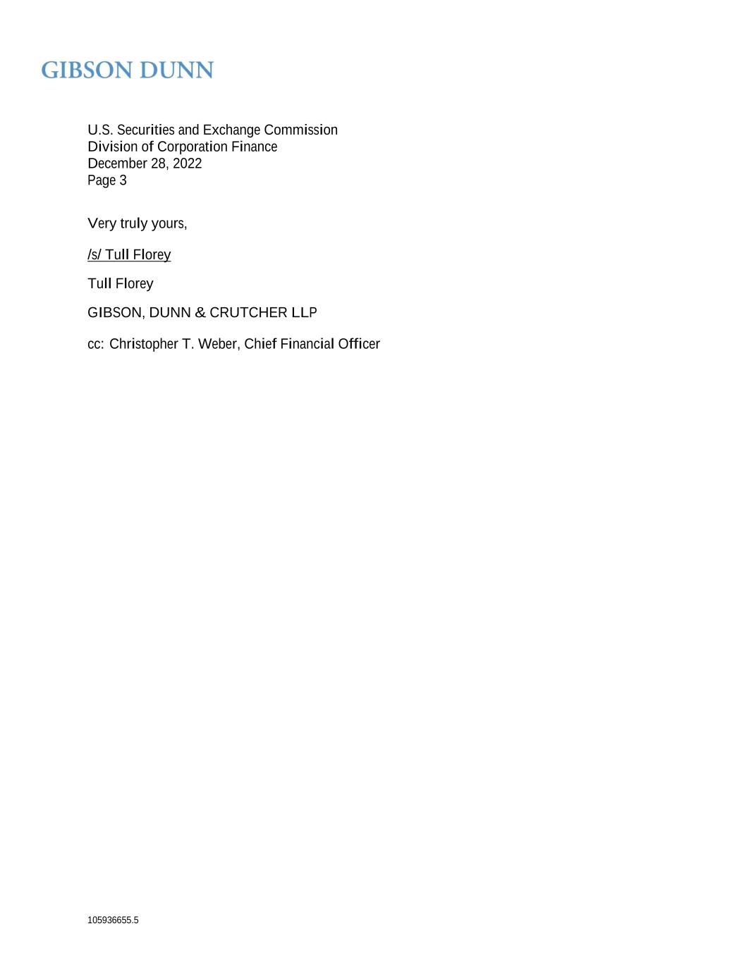 105936655.5 U.S. Securities and Exchange Commission Division of Corporation Finance December 28, 2022 Page 3 Very truly yours, /s/ Tull Florey Tull Florey GIBSON, DUNN & CRUTCHER LLP cc: Christopher T. Weber, Chief Financial Officer