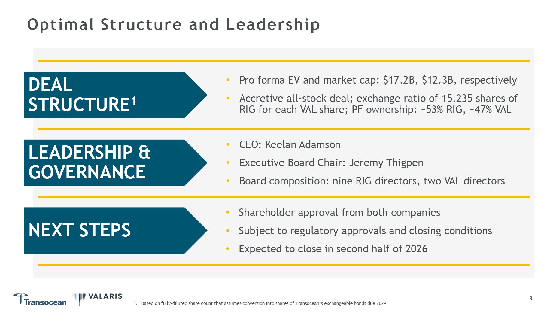Upon completion and on a fully diluted basis, Transocean shareholders will own approximately 53% of the combined company, with Valaris shareholders owning the remaining 47%.