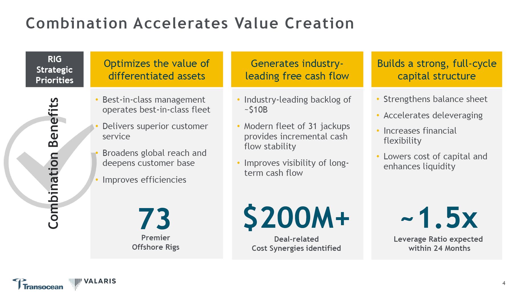Optimal Structure and Leadership  Pro forma EV and market cap: $17.2B, $12.3B, respectively  Accretive all-stock deal; exchange ratio of 15.235 shares of  RIG for each VAL share; PF ownership: ~53% RIG, ~47% VAL  CEO: Keelan Adamson  Executive Board Chair: Jeremy Thigpen  Board composition: nine RIG directors, two VAL directors  Shareholder approval from both companies  Subject to regulatory approvals and closing conditions  Expected to close in second half of 2026  3  DEAL  STRUCTURE1  LEADERSHIP &  GOVERNANCE  NEXT STEPS  1. Based on fully-diluted share count that assumes conversion into shares of Transocean’s exchangeable bonds due 2029