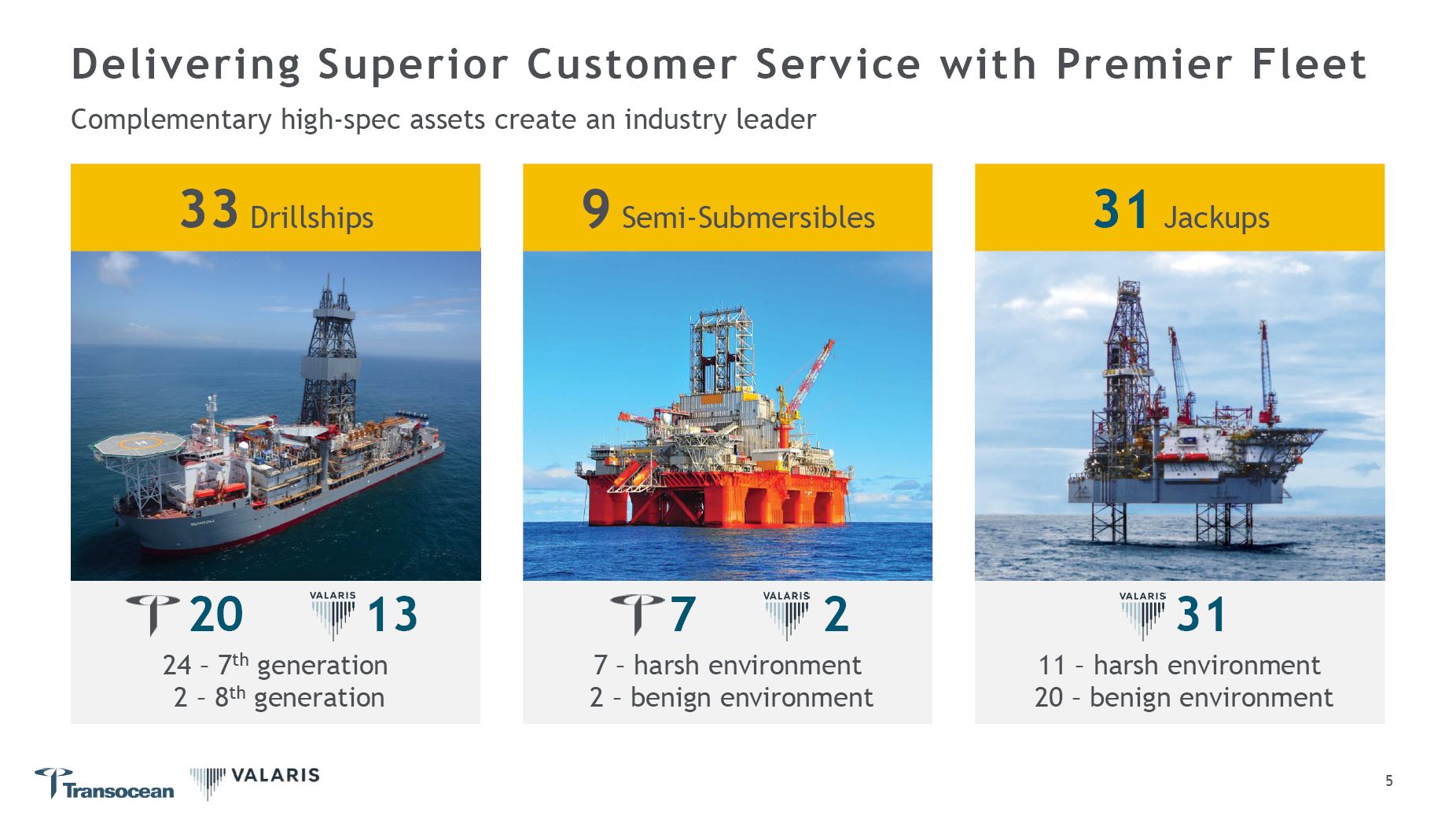 Creates an industry leader with a diversified offshore fleet of 73 rigs, including 33 ultra-deepwater drillships, nine semisubmersibles and 31 modern jackups, to meet emerging growth opportunities
