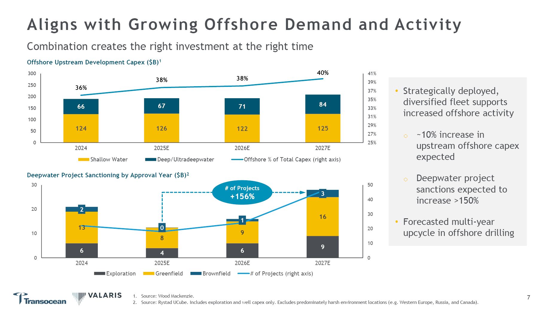 Aligns with Growing Offshore Demand and Activity  Combination creates the right investment at the right time  Offshore Upstream Development Capex ($B)1  6  4  6  9  13  9  16  2  0  8  1  3  0  10  20  30  40  50  0  10  20  2024  2026E  2027E  Exploration  2025E  Greenfield  Deepwater Project Sanctioning by Approval Year ($B)2  30  Brownfield  # of Projects (right axis)  38% 38%  36%  84  66  67  71  124  126  122  125  40%  41%  39%  37%  35%  33%  31%  29%  27%  25%  0  150  100  50  200  250  300  2024  Shallow Water  2025E  Deep/Ultradeepwater  2026E 2027E  Offshore % of Total Capex (right axis)  # of Projects  1. Source: Wood Mackenzie.  2. Source: Rystad UCube. Includes exploration and well capex only. Excludes predominately harsh environment locations (e.g. Western Europe, Russia, and Canada).  7  +156%  Strategically deployed, diversified fleet supports increased offshore activity  ~10% increase in upstream offshore capex expected  Deepwater project sanctions expected to increase >150%  Forecasted multi-year upcycle in offshore drilling