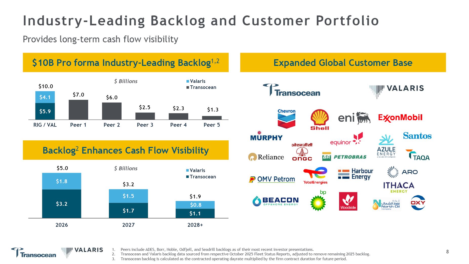 Industry-Leading Backlog and Customer Portfolio  Provides long-term cash flow visibility  Peers include ADES, Borr, Noble, Odfjell, and Seadrill backlogs as of their most recent investor presentations.  Transocean and Valaris backlog data sourced from respective October 2025 Fleet Status Reports, adjusted to remove remaining 2025 backlog.  Transocean backlog is calculated as the contracted operating dayrate multiplied by the firm contract duration for future period.  Expanded Global Customer Base  $10B Pro forma Industry-Leading Backlog1,2  Backlog2 Enhances Cash Flow Visibility  $5.9  $7.0  $6.0  $2.5  $2.3  $1.3  $4.1  RIG / VAL  Peer 1  Peer 2  Peer 3  Peer 4  Peer 5  Valaris Transocean  $10.0  $ Billions  $3.2  $1.7  $1.1  $1.8  $1.5  $0.8  2026  2027  2028+  Valaris  Transocean  $5.0 $ Billions  $3.2  $1.9  8