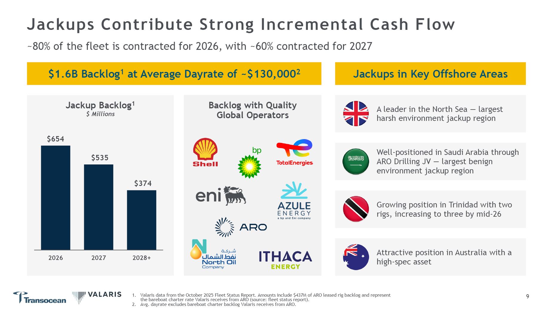 Attractive position in Australia with a high-spec asset  Well-positioned in Saudi Arabia through ARO Drilling JV — largest benign environment jackup region  Growing position in Trinidad with two rigs, increasing to three by mid-26  Backlog with Quality Global Operators  Jackups Contribute Strong Incremental Cash Flow  ~80% of the fleet is contracted for 2026, with ~60% contracted for 2027  Jackups in Key Offshore Areas  $1.6B Backlog1 at Average Dayrate of ~$130,0002  Valaris data from the October 2025 Fleet Status Report. Amounts include $437M of ARO leased rig backlog and represent the bareboat charter rate Valaris receives from ARO (source: fleet status report).  Avg. dayrate excludes bareboat charter backlog Valaris receives from ARO.  Jackup Backlog1  $ Millions  A leader in the North Sea — largest harsh environment jackup region  $654  $535  $374  2026  2027  2028+  9