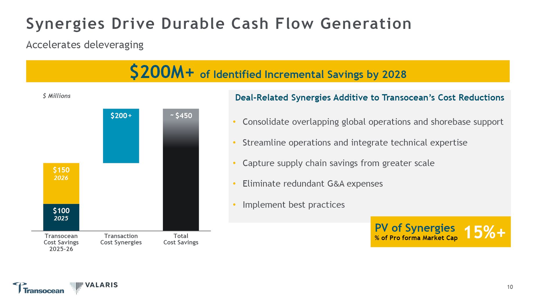 Unlocks more than $200 million in identified cost synergies, additive to Transocean's ongoing cost savings initiative