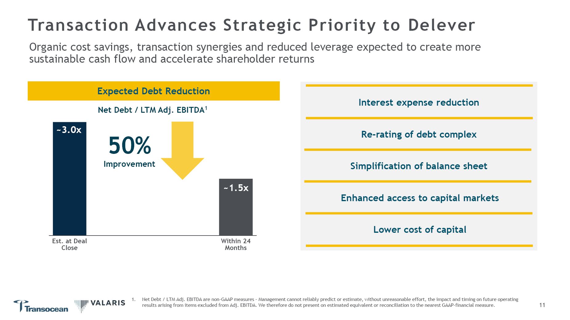 Deal-Related Synergies Additive to Transocean’s Cost Reductions  Consolidate overlapping global operations and shorebase support  Streamline operations and integrate technical expertise  Capture supply chain savings from greater scale  Eliminate redundant G&A expenses  Implement best practices  Synergies Drive Durable Cash Flow Generation  Accelerates deleveraging  $200M+ of Identified Incremental Savings by 2028  $ Millions  $200+  ~ $450  $150  2026  $100  2025  Transocean  Transaction  Total  Cost Savings 2025-26  Cost Synergies  Cost Savings  10  PV of Synergies  % of Pro forma Market Cap  15%+
