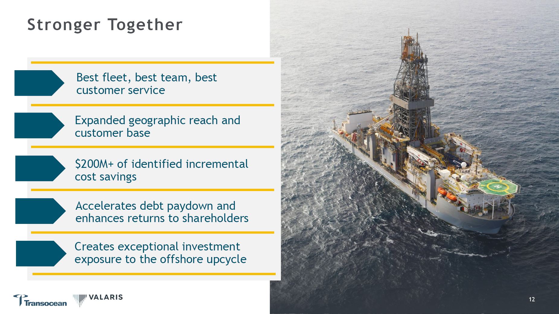 Stronger Together  Best fleet, best team, best customer service  Expanded geographic reach and customer base  $200M+ of identified incremental cost savings  Accelerates debt paydown and enhances returns to shareholders  Creates exceptional investment exposure to the offshore upcycle  12