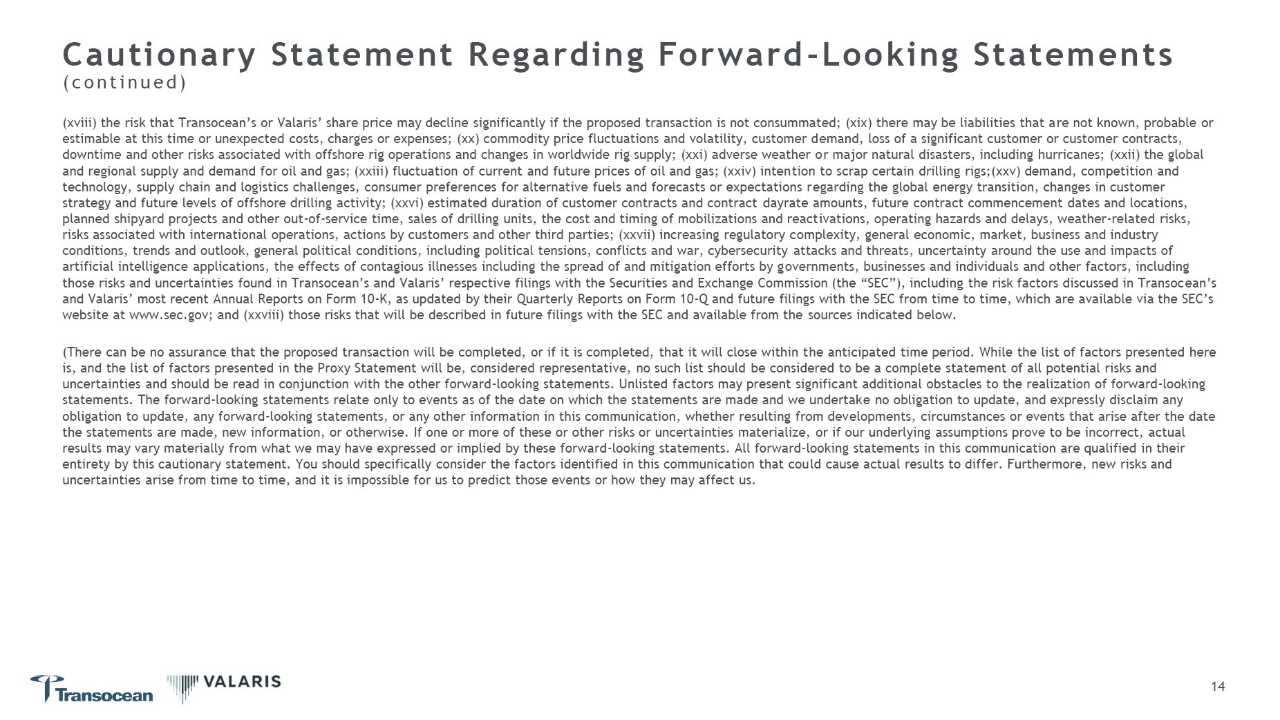 (xviii) the risk that Transocean’s or Valaris’ share price may decline significantly if the proposed transaction is not consummated; (xix) there may be liabilities that are not known, probable or estimable at this time or unexpected costs, charges or expenses; (xx) commodity price fluctuations and volatility, customer demand, loss of a significant customer or customer contracts, downtime and other risks associated with offshore rig operations and changes in worldwide rig supply; (xxi) adverse weather or major natural disasters, including hurricanes; (xxii) the global and regional supply and demand for oil and gas; (xxiii) fluctuation of current and future prices of oil and gas; (xxiv) intention to scrap certain drilling rigs;(xxv) demand, competition and technology, supply chain and logistics challenges, consumer preferences for alternative fuels and forecasts or expectations regarding the global energy transition, changes in customer strategy and future levels of offshore drilling activity; (xxvi) estimated duration of customer contracts and contract dayrate amounts, future contract commencement dates and locations, planned shipyard projects and other out-of-service time, sales of drilling units, the cost and timing of mobilizations and reactivations, operating hazards and delays, weather-related risks, risks associated with international operations, actions by customers and other third parties; (xxvii) increasing regulatory complexity, general economic, market, business and industry conditions, trends and outlook, general political conditions, including political tensions, conflicts and war, cybersecurity attacks and threats, uncertainty around the use and impacts of artificial intelligence applications, the effects of contagious illnesses including the spread of and mitigation efforts by governments, businesses and individuals and other factors, including  those risks and uncertainties found in Transocean’s and Valaris’ respective filings with the Securities and Exchange Commission (the “SEC”), including the risk factors discussed in Transocean’s and Valaris’ most recent Annual Reports on Form 10-K, as updated by their Quarterly Reports on Form 10-Q and future filings with the SEC from time to time, which are available via the SEC’s website at www.sec.gov; and (xxviii) those risks that will be described in future filings with the SEC and available from the sources indicated below.  (There can be no assurance that the proposed transaction will be completed, or if it is completed, that it will close within the anticipated time period. While the list of factors presented here is, and the list of factors presented in the Proxy Statement will be, considered representative, no such list should be considered to be a complete statement of all potential risks and uncertainties and should be read in conjunction with the other forward-looking statements. Unlisted factors may present significant additional obstacles to the realization of forward-looking statements. The forward-looking statements relate only to events as of the date on which the statements are made and we undertake no obligation to update, and expressly disclaim any obligation to update, any forward-looking statements, or any other information in this communication, whether resulting from developments, circumstances or events that arise after the date the statements are made, new information, or otherwise. If one or more of these or other risks or uncertainties materialize, or if our underlying assumptions prove to be incorrect, actual results may vary materially from what we may have expressed or implied by these forward-looking statements. All forward-looking statements in this communication are qualified in their entirety by this cautionary statement. You should specifically consider the factors identified in this communication that could cause actual results to differ. Furthermore, new risks and uncertainties arise from time to time, and it is impossible for us to predict those events or how they may affect us.  12  Cautionary Statement Regarding Forward-Looking Statements  ( c o n t i n u e d )