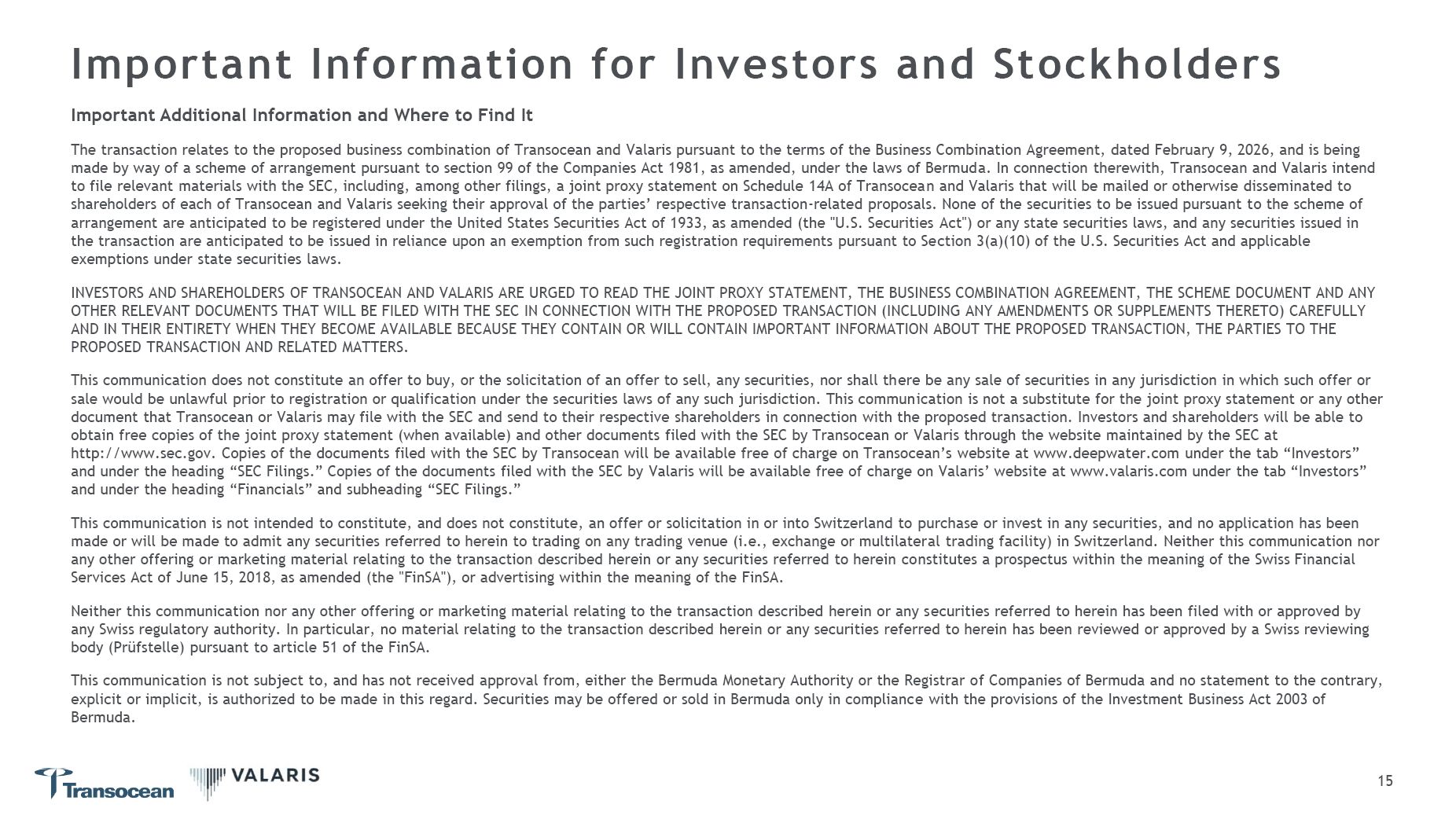 Important Information for Investors and Stockholders  12  Important Additional Information and Where to Find It  The transaction relates to the proposed business combination of Transocean and Valaris pursuant to the terms of the Business Combination Agreement, dated February 9, 2026, and is being made by way of a scheme of arrangement pursuant to section 99 of the Companies Act 1981, as amended, under the laws of Bermuda. In connection therewith, Transocean and Valaris intend to file relevant materials with the SEC, including, among other filings, a joint proxy statement on Schedule 14A of Transocean and Valaris that will be mailed or otherwise disseminated to shareholders of each of Transocean and Valaris seeking their approval of the parties’ respective transaction-related proposals. None of the securities to be issued pursuant to the scheme of arrangement are anticipated to be registered under the United States Securities Act of 1933, as amended (the "U.S. Securities Act") or any state securities laws, and any securities issued in the transaction are anticipated to be issued in reliance upon an exemption from such registration requirements pursuant to Section 3(a)(10) of the U.S. Securities Act and applicable exemptions under state securities laws.  INVESTORS AND SHAREHOLDERS OF TRANSOCEAN AND VALARIS ARE URGED TO READ THE JOINT PROXY STATEMENT, THE BUSINESS COMBINATION AGREEMENT, THE SCHEME DOCUMENT AND ANY OTHER RELEVANT DOCUMENTS THAT WILL BE FILED WITH THE SEC IN CONNECTION WITH THE PROPOSED TRANSACTION (INCLUDING ANY AMENDMENTS OR SUPPLEMENTS THERETO) CAREFULLY AND IN THEIR ENTIRETY WHEN THEY BECOME AVAILABLE BECAUSE THEY CONTAIN OR WILL CONTAIN IMPORTANT INFORMATION ABOUT THE PROPOSED TRANSACTION, THE PARTIES TO THE PROPOSED TRANSACTION AND RELATED MATTERS.  This communication does not constitute an offer to buy, or the solicitation of an offer to sell, any securities, nor shall there be any sale of securities in any jurisdiction in which such offer or sale would be unlawful prior to registration or qualification under the securities laws of any such jurisdiction. This communication is not a substitute for the joint proxy statement or any other document that Transocean or Valaris may file with the SEC and send to their respective shareholders in connection with the proposed transaction. Investors and shareholders will be able to obtain free copies of the joint proxy statement (when available) and other documents filed with the SEC by Transocean or Valaris through the website maintained by the SEC at http://www.sec.gov. Copies of the documents filed with the SEC by Transocean will be available free of charge on Transocean’s website at www.deepwater.com under the tab “Investors” and under the heading “SEC Filings.” Copies of the documents filed with the SEC by Valaris will be available free of charge on Valaris’ website at www.valaris.com under the tab “Investors” and under the heading “Financials” and subheading “SEC Filings.”  This communication is not intended to constitute, and does not constitute, an offer or solicitation in or into Switzerland to purchase or invest in any securities, and no application has been made or will be made to admit any securities referred to herein to trading on any trading venue (i.e., exchange or multilateral trading facility) in Switzerland. Neither this communication nor any other offering or marketing material relating to the transaction described herein or any securities referred to herein constitutes a prospectus within the meaning of the Swiss Financial Services Act of June 15, 2018, as amended (the "FinSA"), or advertising within the meaning of the FinSA.  Neither this communication nor any other offering or marketing material relating to the transaction described herein or any securities referred to herein has been filed with or approved by any Swiss regulatory authority. In particular, no material relating to the transaction described herein or any securities referred to herein has been reviewed or approved by a Swiss reviewing body (Prüfstelle) pursuant to article 51 of the FinSA.  This communication is not subject to, and has not received approval from, either the Bermuda Monetary Authority or the Registrar of Companies of Bermuda and no statement to the contrary, explicit or implicit, is authorized to be made in this regard. Securities may be offered or sold in Bermuda only in compliance with the provisions of the Investment Business Act 2003 of Bermuda.