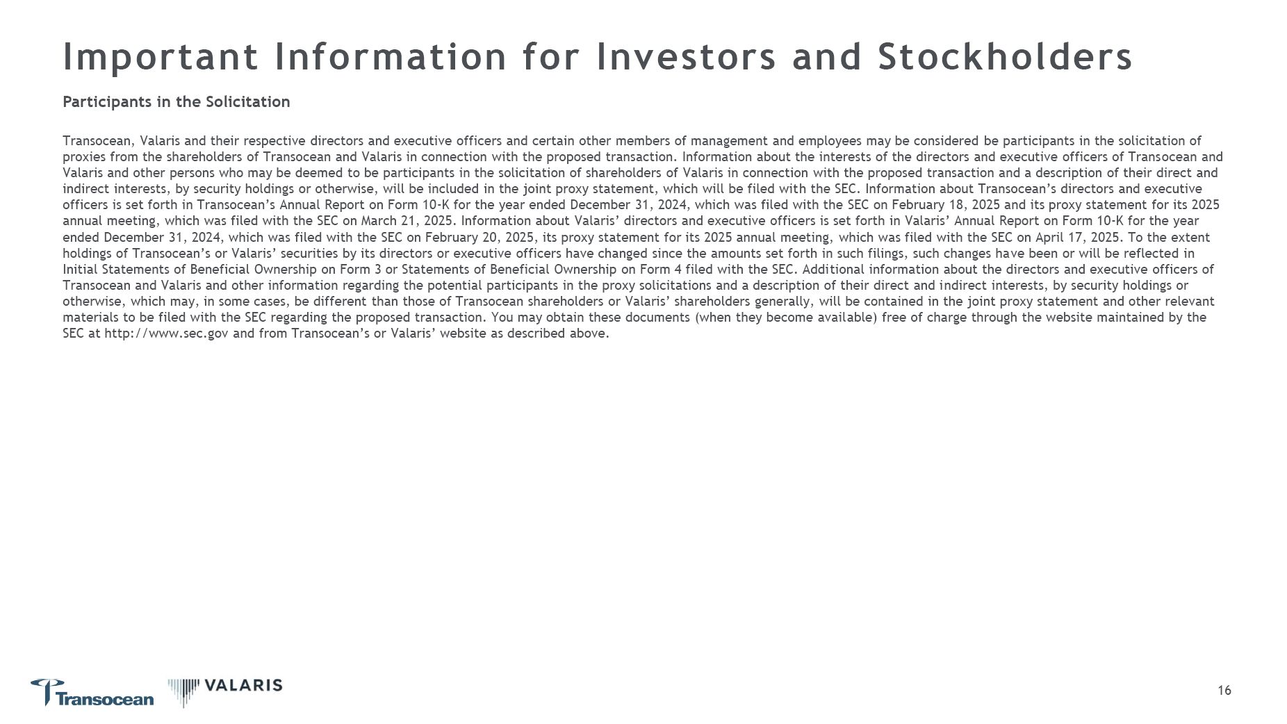Important Information for Investors and Stockholders  12  Participants in the Solicitation  Transocean, Valaris and their respective directors and executive officers and certain other members of management and employees may be considered be participants in the solicitation of proxies from the shareholders of Transocean and Valaris in connection with the proposed transaction. Information about the interests of the directors and executive officers of Transocean and Valaris and other persons who may be deemed to be participants in the solicitation of shareholders of Valaris in connection with the proposed transaction and a description of their direct and indirect interests, by security holdings or otherwise, will be included in the joint proxy statement, which will be filed with the SEC. Information about Transocean’s directors and executive officers is set forth in Transocean’s Annual Report on Form 10-K for the year ended December 31, 2024, which was filed with the SEC on February 18, 2025 and its proxy statement for its 2025 annual meeting, which was filed with the SEC on March 21, 2025. Information about Valaris’ directors and executive officers is set forth in Valaris’ Annual Report on Form 10-K for the year ended December 31, 2024, which was filed with the SEC on February 20, 2025, its proxy statement for its 2025 annual meeting, which was filed with the SEC on April 17, 2025. To the extent holdings of Transocean’s or Valaris’ securities by its directors or executive officers have changed since the amounts set forth in such filings, such changes have been or will be reflected in Initial Statements of Beneficial Ownership on Form 3 or Statements of Beneficial Ownership on Form 4 filed with the SEC. Additional information about the directors and executive officers of Transocean and Valaris and other information regarding the potential participants in the proxy solicitations and a description of their direct and indirect interests, by security holdings or otherwise, which may, in some cases, be different than those of Transocean shareholders or Valaris’ shareholders generally, will be contained in the joint proxy statement and other relevant materials to be filed with the SEC regarding the proposed transaction. You may obtain these documents (when they become available) free of charge through the website maintained by the  SEC at http://www.sec.gov and from Transocean’s or Valaris’ website as described above.