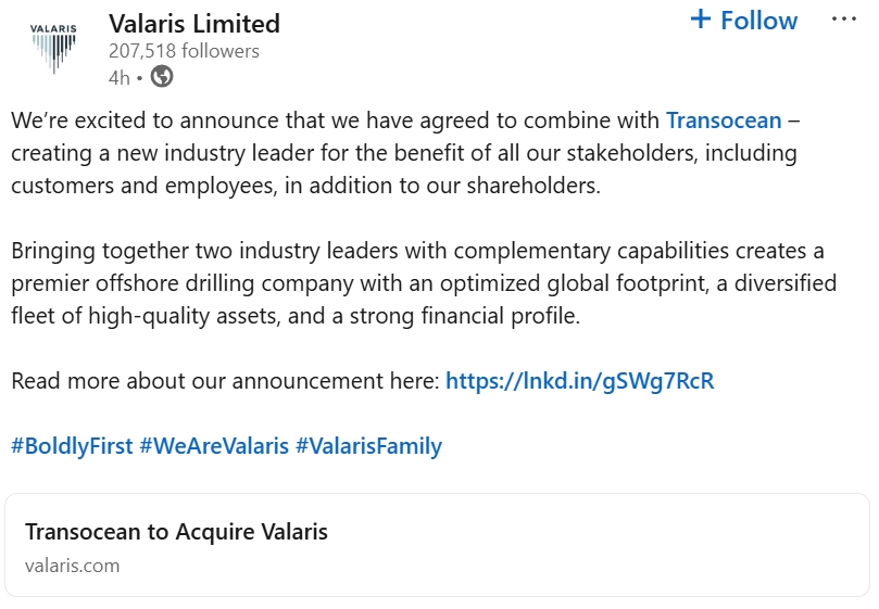 The transaction relates to the proposed business combination of Transocean and Valaris pursuant to the terms of the Business Combination Agreement, dated as of February 9, 2026, and is being made by way of a scheme of arrangement