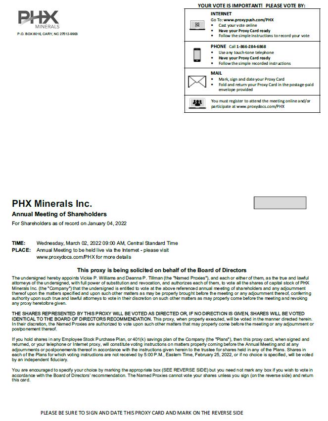 YOUR VOTE IS IMPORTANT! PLEASE VOTE BY: PHX Minerals Inc. INTERNET Go To: www.proxypush.com/PHX • Cast your vote online • Have your Proxy Card ready • Follow the simple instructions to record your vote PHONE Call 1-866-284-6868 • Use any touch-tone telephone • Have your Proxy Card ready • Follow the simple recorded instructions MAIL • Mark, sign and date your Proxy Card • Fold and return your Proxy Card in the postage-paid envelope provided You must register to attend the meeting online and/or participate at www.proxydocs.com/PHXAnnual Meeting of Shareholders For Shareholders as of record on January 04, 2022 TIME: Wednesday, March 02, 2022 09:00 AM, Central Standard Time PLACE: Annual Meeting to be held live via the Internet - please visit www.proxydocs.com/PHX for more details This proxy is being solicited on behalf of the Board of Directors The undersigned hereby appoints Vickie P. Williams and Deanna P. Tillman (the "Named Proxies"), and each or either of them, as the true and lawful attorneys of the undersigned, with full power of substitution and revocation, and authorizes each of them, to vote all the shares of capital stock of PHX Minerals Inc. (the "Company") that the undersigned is entitled to vote at the above referenced annual meeting of shareholders and any adjournment thereof upon the matters specified and upon such other matters as may be properly brought before the meeting or any adjournment thereof, conferring authority upon such true and lawful attorneys to vote in their discretion on such other matters as may properly come before the meeting and revoking any proxy heretofore given. THE SHARES REPRESENTED BY THIS PROXY WILL BE VOTED AS DIRECTED OR, IF NO DIRECTION IS GIVEN, SHARES WILL BE VOTED IDENTICAL TO THE BOARD OF DIRECTORS RECOMMENDATION. This proxy, when properly executed, will be voted in the manner directed herein. In their discretion, the Named Proxies are authorized to vote upon such other matters that may properly come before the meeting or any adjournment or postponement thereof. If you hold shares in any Employee Stock Purchase Plan, or 401(k) savings plan of the Company (the "Plans"), then this proxy card, when signed and returned, or your telephone or Internet proxy, will constitute voting instructions on matters properly coming before the Annual Meeting and at any adjournments or postponements thereof in accordance with the instructions given herein to the trustee for shares held in any of the Plans. Shares in each of the Plans for which voting instructions are not received by 5:00 P.M., Eastern Time, February 25, 2022, or if no choice is specified, will be voted by an independent fiduciary. You are encouraged to specify your choice by marking the appropriate box (SEE REVERSE SIDE) but you need not mark any box if you wish to vote in accordance with the Board of Directors’ recommendation. The Named Proxies cannot vote your shares unless you sign (on the reverse side) and return this card. PLEASE BE SURE TO SIGN AND DATE THIS PROXY CARD AND MARK ON THE REVERSE SIDE