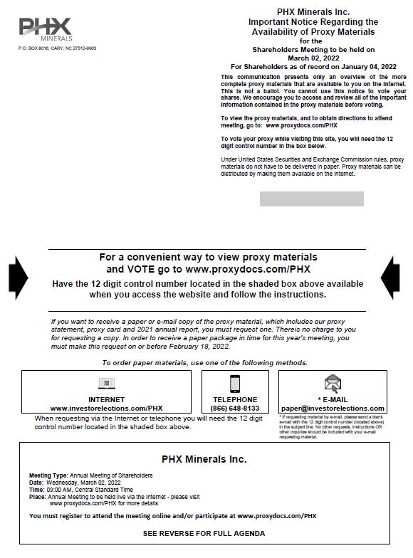 PHX MINERALS P.O. BOX 8016, CARY, NC 27512-9903 PHX Minerals Inc. Important Notice Regarding the Availability to proxy Materials for the Shareholders Meeting to be held on March 02,2022 For Shareholders as of record on January 04, 2022 For Shareholders as of January 04, 2022 This communication presents only an overview of the more complete proxy material that are available to you on the Internet. This ls not a ballot. You cannot use this notice to vote your shares. We encourage you to access and review of the Important Information contained In the proxy materials before voting. To view the proxy materials, and to obtain directions to attend meeting, go to: www.proxydocs.com/PHX To vote your proxy while vaulting this late, you will need 12 digit control number In the box below. Under United States Securities and Exchange Commission rules, proxy materials do not have to be delivered In paper. Proxy materials can be distributed by making them available the Internet. For a convenient way to view proxy materials and VOTE go to www.proxydocs.com/PHX Have the 12 digit control number located in the shaded box above available when you access the website and follow the instructions. If you want to receive a paper or e-mail copy of the proxy material, which includes our proxy statement, proxy card and 2021 annual report, you must request one. There is no charge to you for requesting a copy. In order to receive a paper package in time for this year's meeting, you must make this request on or before February 18, 2022. To order paper materials, use one of the following methods. LOGO INTERNET www.investorerelections.com/PHX LOGO TELEPHONE (866) 648-8133 LOGO * E-MAIL paper@investorelections.com When requesting via the Internet or telephone you will need the 12 digit control number located in the shaded box above. * If requesting material by e-mail please send a blank e-mail with the 12 digit control number (located above) in the subject line. No other requests, instructions OR other inquiries should be included with your e-mail requesting material. PHX MINERALS Inc. Meeting Type: Annual Meeting of Shareholders Date: Wednesday, March 02, 2022 Time: 09:00 AM, Central Standard Time Place: Annual Meeting to be held live via the internet-please visit www.proxydocs.com/PHX for more details You must register to attend the meeting online and/or participate at www.proxydocs.com/PHX SEE REVERSE FOR FULL AGENDA