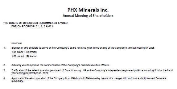 PHX Minerals Inc. Annual Meeting of Shareholders THE BOARD OF DIRECTORS RECOMMENDS A VOTE: FOR ON PROPOSALS 1, 2, 3, AND 4 PROPOSAL 1. Election of two directors to serve on the Company’s board for three-year terms ending at the Company’s annual meeting in 2025. 1.01 Mark T. Behrman 1.02 John H. Pinkerton 2. Advisory vote to approve the compensation of the Company’s named executive officers. 3. Ratification of the selection and appointment of Emst & Young LLP as the Company’s independent registered public accounting firm for the fiscal year ending September 30, 2022. 4. Approval of the reincorporation of the Company from Oklahoma to Delaware by means of a merger with and into a wholly owned Delaware subsidiary.