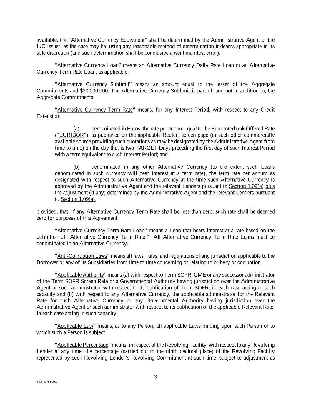 3 14102835v4 available, the “Alternative Currency Equivalent” shall be determined by the Administrative Agent or the L/C Issuer, as the case may be, using any reasonable method of determination it deems appropriate in its sole discretion (and such determination shall be conclusive absent manifest error). “Alternative Currency Loan” means an Alternative Currency Daily Rate Loan or an Alternative Currency Term Rate Loan, as applicable. “Alternative Currency Sublimit” means an amount equal to the lesser of the Aggregate Commitments and $30,000,000. The Alternative Currency Sublimit is part of, and not in addition to, the Aggregate Commitments. “Alternative Currency Term Rate” means, for any Interest Period, with respect to any Credit Extension: (a) denominated in Euros, the rate per annum equal to the Euro Interbank Offered Rate (“EURIBOR”), as published on the applicable Reuters screen page (or such other commercially available source providing such quotations as may be designated by the Administrative Agent from time to time) on the day that is two TARGET Days preceding the first day of such Interest Period with a term equivalent to such Interest Period; and (b) denominated in any other Alternative Currency (to the extent such Loans denominated in such currency will bear interest at a term rate), the term rate per annum as designated with respect to such Alternative Currency at the time such Alternative Currency is approved by the Administrative Agent and the relevant Lenders pursuant to Section 1.09(a) plus the adjustment (if any) determined by the Administrative Agent and the relevant Lenders pursuant to Section 1.09(a); provided, that, if any Alternative Currency Term Rate shall be less than zero, such rate shall be deemed zero for purposes of this Agreement. “Alternative Currency Term Rate Loan” means a Loan that bears interest at a rate based on the definition of “Alternative Currency Term Rate.” All Alternative Currency Term Rate Loans must be denominated in an Alternative Currency. “Anti-Corruption Laws” means all laws, rules, and regulations of any jurisdiction applicable to the Borrower or any of its Subsidiaries from time to time concerning or relating to bribery or corruption. “Applicable Authority” means (a) with respect to Term SOFR, CME or any successor administrator of the Term SOFR Screen Rate or a Governmental Authority having jurisdiction over the Administrative Agent or such administrator with respect to its publication of Term SOFR, in each case acting in such capacity and (b) with respect to any Alternative Currency, the applicable administrator for the Relevant Rate for such Alternative Currency or any Governmental Authority having jurisdiction over the Administrative Agent or such administrator with respect to its publication of the applicable Relevant Rate, in each case acting in such capacity. “Applicable Law” means, as to any Person, all applicable Laws binding upon such Person or to which such a Person is subject. “Applicable Percentage” means, in respect of the Revolving Facility, with respect to any Revolving Lender at any time, the percentage (carried out to the ninth decimal place) of the Revolving Facility represented by such Revolving Lender’s Revolving Commitment at such time, subject to adjustment as