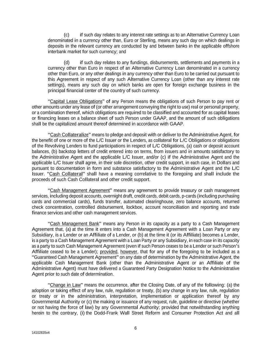 6 14102835v4 (c) if such day relates to any interest rate settings as to an Alternative Currency Loan denominated in a currency other than, Euro or Sterling, means any such day on which dealings in deposits in the relevant currency are conducted by and between banks in the applicable offshore interbank market for such currency; and (d) if such day relates to any fundings, disbursements, settlements and payments in a currency other than Euro in respect of an Alternative Currency Loan denominated in a currency other than Euro, or any other dealings in any currency other than Euro to be carried out pursuant to this Agreement in respect of any such Alternative Currency Loan (other than any interest rate settings), means any such day on which banks are open for foreign exchange business in the principal financial center of the country of such currency. “Capital Lease Obligations” of any Person means the obligations of such Person to pay rent or other amounts under any lease of (or other arrangement conveying the right to use) real or personal property, or a combination thereof, which obligations are required to be classified and accounted for as capital leases or financing leases on a balance sheet of such Person under GAAP, and the amount of such obligations shall be the capitalized amount thereof determined in accordance with GAAP. “Cash Collateralize” means to pledge and deposit with or deliver to the Administrative Agent, for the benefit of one or more of the L/C Issuer or the Lenders, as collateral for L/C Obligations or obligations of the Revolving Lenders to fund participations in respect of L/C Obligations, (a) cash or deposit account balances, (b) backstop letters of credit entered into on terms, from issuers and in amounts satisfactory to the Administrative Agent and the applicable L/C Issuer, and/or (c) if the Administrative Agent and the applicable L/C Issuer shall agree, in their sole discretion, other credit support, in each case, in Dollars and pursuant to documentation in form and substance satisfactory to the Administrative Agent and the L/C Issuer. “Cash Collateral” shall have a meaning correlative to the foregoing and shall include the proceeds of such Cash Collateral and other credit support. “Cash Management Agreement” means any agreement to provide treasury or cash management services, including deposit accounts, overnight draft, credit cards, debit cards, p-cards (including purchasing cards and commercial cards), funds transfer, automated clearinghouse, zero balance accounts, returned check concentration, controlled disbursement, lockbox, account reconciliation and reporting and trade finance services and other cash management services. “Cash Management Bank” means any Person in its capacity as a party to a Cash Management Agreement that, (a) at the time it enters into a Cash Management Agreement with a Loan Party or any Subsidiary, is a Lender or an Affiliate of a Lender, or (b) at the time it (or its Affiliate) becomes a Lender, is a party to a Cash Management Agreement with a Loan Party or any Subsidiary, in each case in its capacity as a party to such Cash Management Agreement (even if such Person ceases to be a Lender or such Person’s Affiliate ceased to be a Lender); provided, however, that for any of the foregoing to be included as a “Guaranteed Cash Management Agreement” on any date of determination by the Administrative Agent, the applicable Cash Management Bank (other than the Administrative Agent or an Affiliate of the Administrative Agent) must have delivered a Guaranteed Party Designation Notice to the Administrative Agent prior to such date of determination. “Change in Law” means the occurrence, after the Closing Date, of any of the following: (a) the adoption or taking effect of any law, rule, regulation or treaty, (b) any change in any law, rule, regulation or treaty or in the administration, interpretation, implementation or application thereof by any Governmental Authority or (c) the making or issuance of any request, rule, guideline or directive (whether or not having the force of law) by any Governmental Authority; provided that notwithstanding anything herein to the contrary, (i) the Dodd-Frank Wall Street Reform and Consumer Protection Act and all