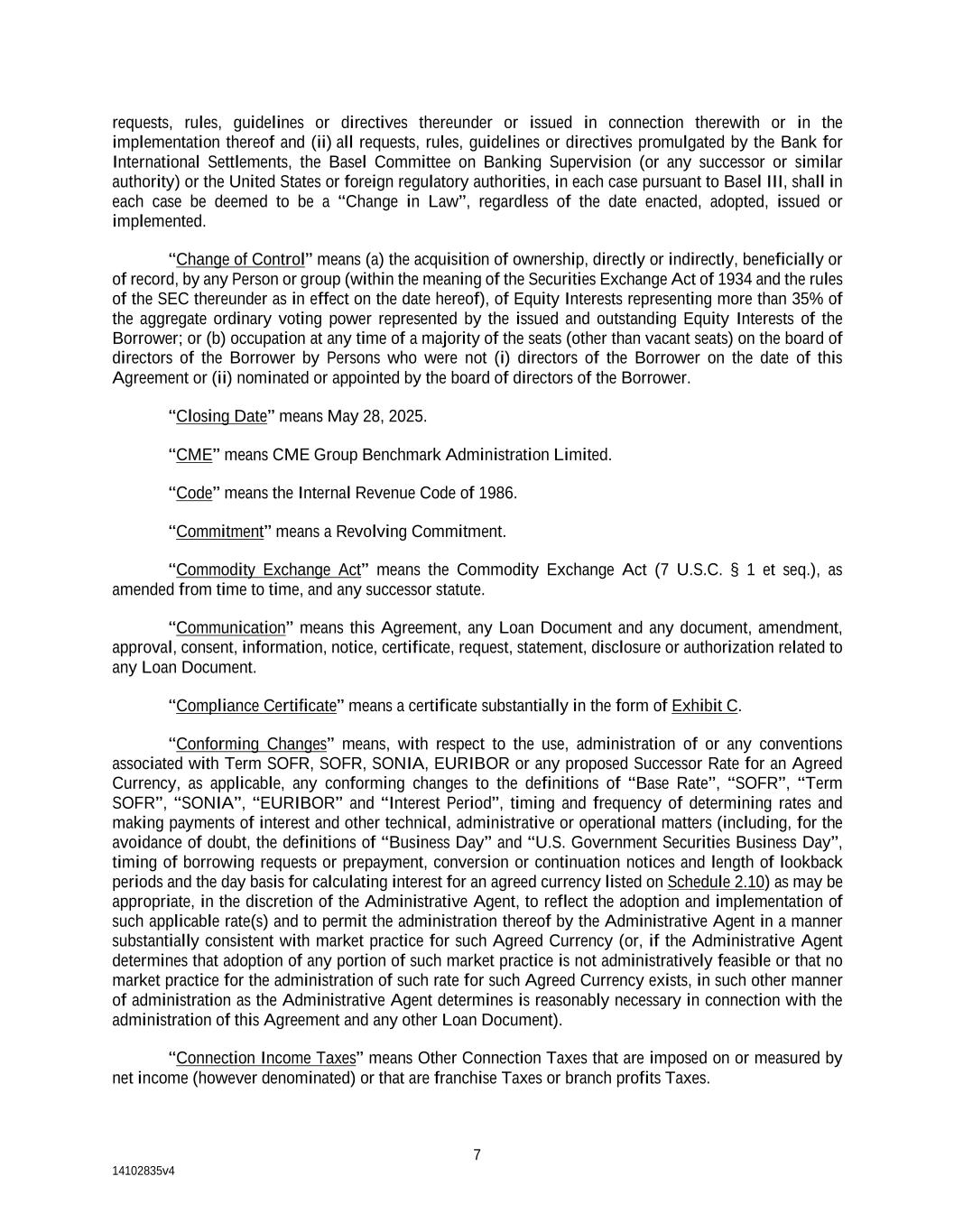 7 14102835v4 requests, rules, guidelines or directives thereunder or issued in connection therewith or in the implementation thereof and (ii) all requests, rules, guidelines or directives promulgated by the Bank for International Settlements, the Basel Committee on Banking Supervision (or any successor or similar authority) or the United States or foreign regulatory authorities, in each case pursuant to Basel III, shall in each case be deemed to be a “Change in Law”, regardless of the date enacted, adopted, issued or implemented. “Change of Control” means (a) the acquisition of ownership, directly or indirectly, beneficially or of record, by any Person or group (within the meaning of the Securities Exchange Act of 1934 and the rules of the SEC thereunder as in effect on the date hereof), of Equity Interests representing more than 35% of the aggregate ordinary voting power represented by the issued and outstanding Equity Interests of the Borrower; or (b) occupation at any time of a majority of the seats (other than vacant seats) on the board of directors of the Borrower by Persons who were not (i) directors of the Borrower on the date of this Agreement or (ii) nominated or appointed by the board of directors of the Borrower. “Closing Date” means May 28, 2025. “CME” means CME Group Benchmark Administration Limited. “Code” means the Internal Revenue Code of 1986. “Commitment” means a Revolving Commitment. “Commodity Exchange Act” means the Commodity Exchange Act (7 U.S.C. § 1 et seq.), as amended from time to time, and any successor statute. “Communication” means this Agreement, any Loan Document and any document, amendment, approval, consent, information, notice, certificate, request, statement, disclosure or authorization related to any Loan Document. “Compliance Certificate” means a certificate substantially in the form of Exhibit C. “Conforming Changes” means, with respect to the use, administration of or any conventions associated with Term SOFR, SOFR, SONIA, EURIBOR or any proposed Successor Rate for an Agreed Currency, as applicable, any conforming changes to the definitions of “Base Rate”, “SOFR”, “Term SOFR”, “SONIA”, “EURIBOR” and “Interest Period”, timing and frequency of determining rates and making payments of interest and other technical, administrative or operational matters (including, for the avoidance of doubt, the definitions of “Business Day” and “U.S. Government Securities Business Day”, timing of borrowing requests or prepayment, conversion or continuation notices and length of lookback periods and the day basis for calculating interest for an agreed currency listed on Schedule 2.10) as may be appropriate, in the discretion of the Administrative Agent, to reflect the adoption and implementation of such applicable rate(s) and to permit the administration thereof by the Administrative Agent in a manner substantially consistent with market practice for such Agreed Currency (or, if the Administrative Agent determines that adoption of any portion of such market practice is not administratively feasible or that no market practice for the administration of such rate for such Agreed Currency exists, in such other manner of administration as the Administrative Agent determines is reasonably necessary in connection with the administration of this Agreement and any other Loan Document). “Connection Income Taxes” means Other Connection Taxes that are imposed on or measured by net income (however denominated) or that are franchise Taxes or branch profits Taxes.