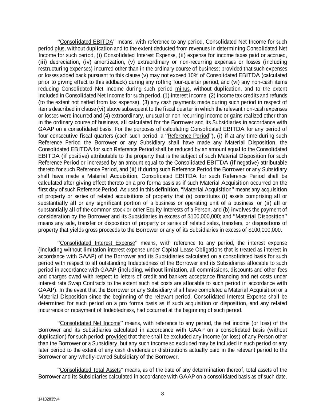 8 14102835v4 “Consolidated EBITDA” means, with reference to any period, Consolidated Net Income for such period plus, without duplication and to the extent deducted from revenues in determining Consolidated Net Income for such period, (i) Consolidated Interest Expense, (ii) expense for income taxes paid or accrued, (iii) depreciation, (iv) amortization, (v) extraordinary or non-recurring expenses or losses (including restructuring expenses) incurred other than in the ordinary course of business; provided that such expenses or losses added back pursuant to this clause (v) may not exceed 10% of Consolidated EBITDA (calculated prior to giving effect to this addback) during any rolling four-quarter period, and (vi) any non-cash items reducing Consolidated Net Income during such period minus, without duplication, and to the extent included in Consolidated Net Income for such period, (1) interest income, (2) income tax credits and refunds (to the extent not netted from tax expense), (3) any cash payments made during such period in respect of items described in clause (vi) above subsequent to the fiscal quarter in which the relevant non-cash expenses or losses were incurred and (4) extraordinary, unusual or non-recurring income or gains realized other than in the ordinary course of business, all calculated for the Borrower and its Subsidiaries in accordance with GAAP on a consolidated basis. For the purposes of calculating Consolidated EBITDA for any period of four consecutive fiscal quarters (each such period, a “Reference Period”), (i) if at any time during such Reference Period the Borrower or any Subsidiary shall have made any Material Disposition, the Consolidated EBITDA for such Reference Period shall be reduced by an amount equal to the Consolidated EBITDA (if positive) attributable to the property that is the subject of such Material Disposition for such Reference Period or increased by an amount equal to the Consolidated EBITDA (if negative) attributable thereto for such Reference Period, and (ii) if during such Reference Period the Borrower or any Subsidiary shall have made a Material Acquisition, Consolidated EBITDA for such Reference Period shall be calculated after giving effect thereto on a pro forma basis as if such Material Acquisition occurred on the first day of such Reference Period. As used in this definition, “Material Acquisition” means any acquisition of property or series of related acquisitions of property that (a) constitutes (i) assets comprising all or substantially all or any significant portion of a business or operating unit of a business, or (ii) all or substantially all of the common stock or other Equity Interests of a Person, and (b) involves the payment of consideration by the Borrower and its Subsidiaries in excess of $100,000,000; and “Material Disposition” means any sale, transfer or disposition of property or series of related sales, transfers, or dispositions of property that yields gross proceeds to the Borrower or any of its Subsidiaries in excess of $100,000,000. “Consolidated Interest Expense” means, with reference to any period, the interest expense (including without limitation interest expense under Capital Lease Obligations that is treated as interest in accordance with GAAP) of the Borrower and its Subsidiaries calculated on a consolidated basis for such period with respect to all outstanding Indebtedness of the Borrower and its Subsidiaries allocable to such period in accordance with GAAP (including, without limitation, all commissions, discounts and other fees and charges owed with respect to letters of credit and bankers acceptance financing and net costs under interest rate Swap Contracts to the extent such net costs are allocable to such period in accordance with GAAP). In the event that the Borrower or any Subsidiary shall have completed a Material Acquisition or a Material Disposition since the beginning of the relevant period, Consolidated Interest Expense shall be determined for such period on a pro forma basis as if such acquisition or disposition, and any related incurrence or repayment of Indebtedness, had occurred at the beginning of such period. “Consolidated Net Income” means, with reference to any period, the net income (or loss) of the Borrower and its Subsidiaries calculated in accordance with GAAP on a consolidated basis (without duplication) for such period; provided that there shall be excluded any income (or loss) of any Person other than the Borrower or a Subsidiary, but any such income so excluded may be included in such period or any later period to the extent of any cash dividends or distributions actually paid in the relevant period to the Borrower or any wholly-owned Subsidiary of the Borrower. “Consolidated Total Assets” means, as of the date of any determination thereof, total assets of the Borrower and its Subsidiaries calculated in accordance with GAAP on a consolidated basis as of such date.