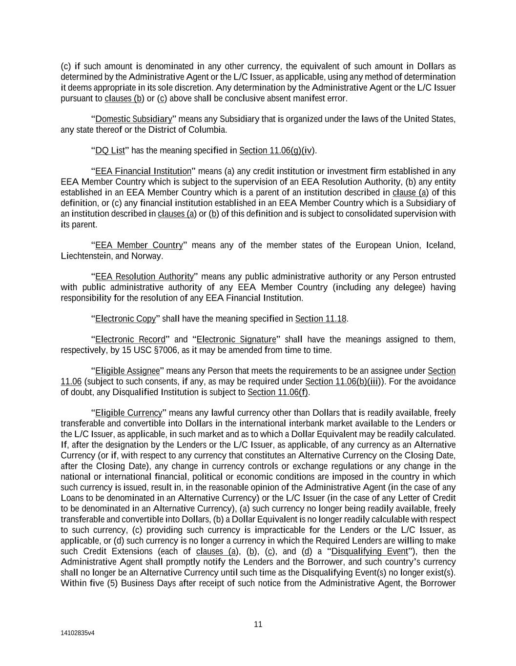 11 14102835v4 (c) if such amount is denominated in any other currency, the equivalent of such amount in Dollars as determined by the Administrative Agent or the L/C Issuer, as applicable, using any method of determination it deems appropriate in its sole discretion. Any determination by the Administrative Agent or the L/C Issuer pursuant to clauses (b) or (c) above shall be conclusive absent manifest error. “Domestic Subsidiary” means any Subsidiary that is organized under the laws of the United States, any state thereof or the District of Columbia. “DQ List” has the meaning specified in Section 11.06(g)(iv). “EEA Financial Institution” means (a) any credit institution or investment firm established in any EEA Member Country which is subject to the supervision of an EEA Resolution Authority, (b) any entity established in an EEA Member Country which is a parent of an institution described in clause (a) of this definition, or (c) any financial institution established in an EEA Member Country which is a Subsidiary of an institution described in clauses (a) or (b) of this definition and is subject to consolidated supervision with its parent. “EEA Member Country” means any of the member states of the European Union, Iceland, Liechtenstein, and Norway. “EEA Resolution Authority” means any public administrative authority or any Person entrusted with public administrative authority of any EEA Member Country (including any delegee) having responsibility for the resolution of any EEA Financial Institution. “Electronic Copy” shall have the meaning specified in Section 11.18. “Electronic Record” and “Electronic Signature” shall have the meanings assigned to them, respectively, by 15 USC §7006, as it may be amended from time to time. “Eligible Assignee” means any Person that meets the requirements to be an assignee under Section 11.06 (subject to such consents, if any, as may be required under Section 11.06(b)(iii)). For the avoidance of doubt, any Disqualified Institution is subject to Section 11.06(f). “Eligible Currency” means any lawful currency other than Dollars that is readily available, freely transferable and convertible into Dollars in the international interbank market available to the Lenders or the L/C Issuer, as applicable, in such market and as to which a Dollar Equivalent may be readily calculated. If, after the designation by the Lenders or the L/C Issuer, as applicable, of any currency as an Alternative Currency (or if, with respect to any currency that constitutes an Alternative Currency on the Closing Date, after the Closing Date), any change in currency controls or exchange regulations or any change in the national or international financial, political or economic conditions are imposed in the country in which such currency is issued, result in, in the reasonable opinion of the Administrative Agent (in the case of any Loans to be denominated in an Alternative Currency) or the L/C Issuer (in the case of any Letter of Credit to be denominated in an Alternative Currency), (a) such currency no longer being readily available, freely transferable and convertible into Dollars, (b) a Dollar Equivalent is no longer readily calculable with respect to such currency, (c) providing such currency is impracticable for the Lenders or the L/C Issuer, as applicable, or (d) such currency is no longer a currency in which the Required Lenders are willing to make such Credit Extensions (each of clauses (a), (b), (c), and (d) a “Disqualifying Event”), then the Administrative Agent shall promptly notify the Lenders and the Borrower, and such country’s currency shall no longer be an Alternative Currency until such time as the Disqualifying Event(s) no longer exist(s). Within five (5) Business Days after receipt of such notice from the Administrative Agent, the Borrower