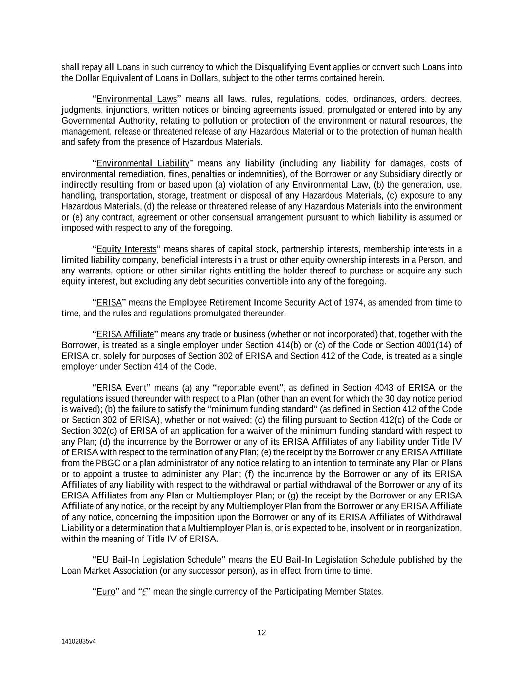 12 14102835v4 shall repay all Loans in such currency to which the Disqualifying Event applies or convert such Loans into the Dollar Equivalent of Loans in Dollars, subject to the other terms contained herein. “Environmental Laws” means all laws, rules, regulations, codes, ordinances, orders, decrees, judgments, injunctions, written notices or binding agreements issued, promulgated or entered into by any Governmental Authority, relating to pollution or protection of the environment or natural resources, the management, release or threatened release of any Hazardous Material or to the protection of human health and safety from the presence of Hazardous Materials. “Environmental Liability” means any liability (including any liability for damages, costs of environmental remediation, fines, penalties or indemnities), of the Borrower or any Subsidiary directly or indirectly resulting from or based upon (a) violation of any Environmental Law, (b) the generation, use, handling, transportation, storage, treatment or disposal of any Hazardous Materials, (c) exposure to any Hazardous Materials, (d) the release or threatened release of any Hazardous Materials into the environment or (e) any contract, agreement or other consensual arrangement pursuant to which liability is assumed or imposed with respect to any of the foregoing. “Equity Interests” means shares of capital stock, partnership interests, membership interests in a limited liability company, beneficial interests in a trust or other equity ownership interests in a Person, and any warrants, options or other similar rights entitling the holder thereof to purchase or acquire any such equity interest, but excluding any debt securities convertible into any of the foregoing. “ERISA” means the Employee Retirement Income Security Act of 1974, as amended from time to time, and the rules and regulations promulgated thereunder. “ERISA Affiliate” means any trade or business (whether or not incorporated) that, together with the Borrower, is treated as a single employer under Section 414(b) or (c) of the Code or Section 4001(14) of ERISA or, solely for purposes of Section 302 of ERISA and Section 412 of the Code, is treated as a single employer under Section 414 of the Code. “ERISA Event” means (a) any “reportable event”, as defined in Section 4043 of ERISA or the regulations issued thereunder with respect to a Plan (other than an event for which the 30 day notice period is waived); (b) the failure to satisfy the “minimum funding standard” (as defined in Section 412 of the Code or Section 302 of ERISA), whether or not waived; (c) the filing pursuant to Section 412(c) of the Code or Section 302(c) of ERISA of an application for a waiver of the minimum funding standard with respect to any Plan; (d) the incurrence by the Borrower or any of its ERISA Affiliates of any liability under Title IV of ERISA with respect to the termination of any Plan; (e) the receipt by the Borrower or any ERISA Affiliate from the PBGC or a plan administrator of any notice relating to an intention to terminate any Plan or Plans or to appoint a trustee to administer any Plan; (f) the incurrence by the Borrower or any of its ERISA Affiliates of any liability with respect to the withdrawal or partial withdrawal of the Borrower or any of its ERISA Affiliates from any Plan or Multiemployer Plan; or (g) the receipt by the Borrower or any ERISA Affiliate of any notice, or the receipt by any Multiemployer Plan from the Borrower or any ERISA Affiliate of any notice, concerning the imposition upon the Borrower or any of its ERISA Affiliates of Withdrawal Liability or a determination that a Multiemployer Plan is, or is expected to be, insolvent or in reorganization, within the meaning of Title IV of ERISA. “EU Bail-In Legislation Schedule” means the EU Bail-In Legislation Schedule published by the Loan Market Association (or any successor person), as in effect from time to time. “Euro” and “€” mean the single currency of the Participating Member States.