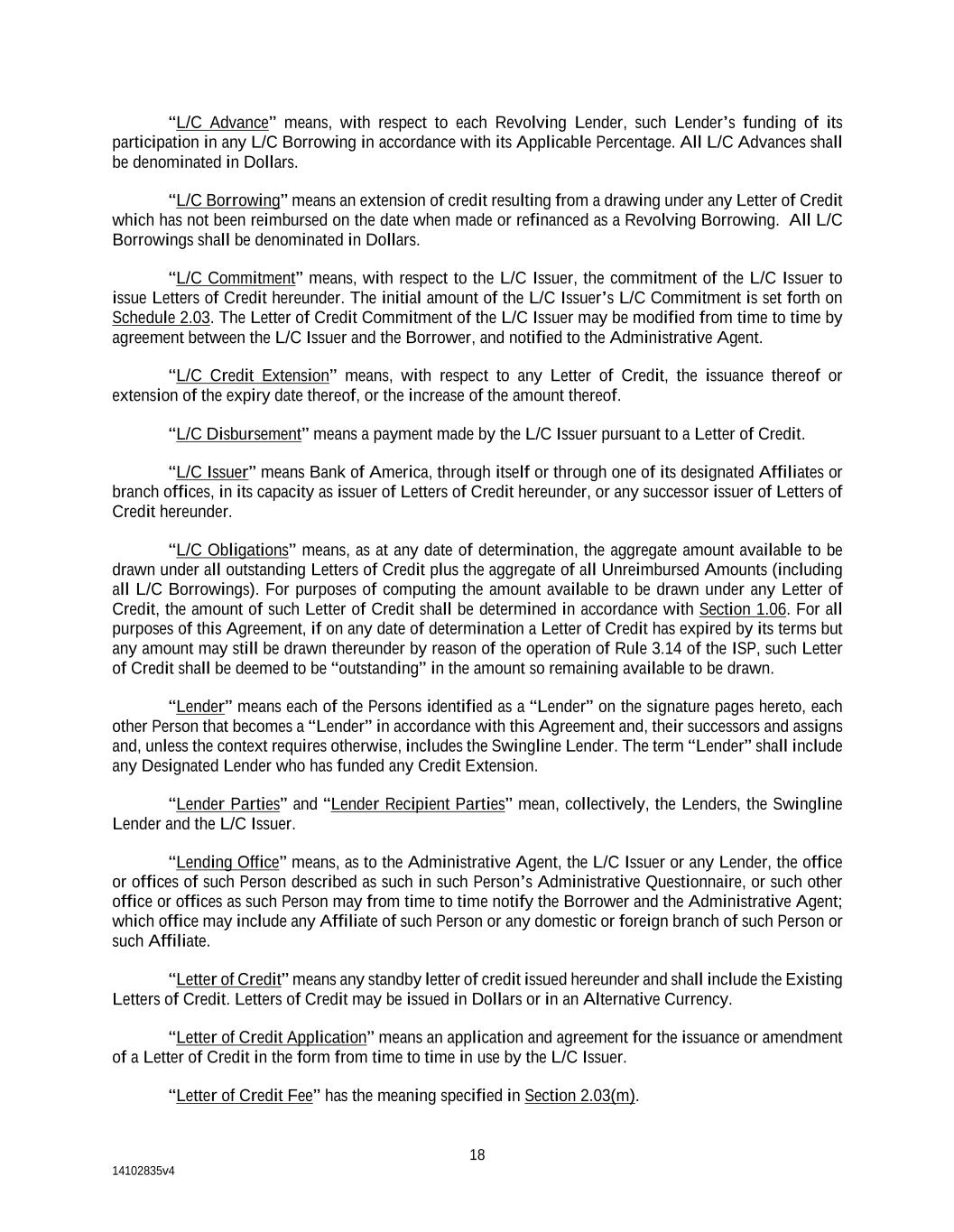 18 14102835v4 “L/C Advance” means, with respect to each Revolving Lender, such Lender’s funding of its participation in any L/C Borrowing in accordance with its Applicable Percentage. All L/C Advances shall be denominated in Dollars. “L/C Borrowing” means an extension of credit resulting from a drawing under any Letter of Credit which has not been reimbursed on the date when made or refinanced as a Revolving Borrowing. All L/C Borrowings shall be denominated in Dollars. “L/C Commitment” means, with respect to the L/C Issuer, the commitment of the L/C Issuer to issue Letters of Credit hereunder. The initial amount of the L/C Issuer’s L/C Commitment is set forth on Schedule 2.03. The Letter of Credit Commitment of the L/C Issuer may be modified from time to time by agreement between the L/C Issuer and the Borrower, and notified to the Administrative Agent. “L/C Credit Extension” means, with respect to any Letter of Credit, the issuance thereof or extension of the expiry date thereof, or the increase of the amount thereof. “L/C Disbursement” means a payment made by the L/C Issuer pursuant to a Letter of Credit. “L/C Issuer” means Bank of America, through itself or through one of its designated Affiliates or branch offices, in its capacity as issuer of Letters of Credit hereunder, or any successor issuer of Letters of Credit hereunder. “L/C Obligations” means, as at any date of determination, the aggregate amount available to be drawn under all outstanding Letters of Credit plus the aggregate of all Unreimbursed Amounts (including all L/C Borrowings). For purposes of computing the amount available to be drawn under any Letter of Credit, the amount of such Letter of Credit shall be determined in accordance with Section 1.06. For all purposes of this Agreement, if on any date of determination a Letter of Credit has expired by its terms but any amount may still be drawn thereunder by reason of the operation of Rule 3.14 of the ISP, such Letter of Credit shall be deemed to be “outstanding” in the amount so remaining available to be drawn. “Lender” means each of the Persons identified as a “Lender” on the signature pages hereto, each other Person that becomes a “Lender” in accordance with this Agreement and, their successors and assigns and, unless the context requires otherwise, includes the Swingline Lender. The term “Lender” shall include any Designated Lender who has funded any Credit Extension. “Lender Parties” and “Lender Recipient Parties” mean, collectively, the Lenders, the Swingline Lender and the L/C Issuer. “Lending Office” means, as to the Administrative Agent, the L/C Issuer or any Lender, the office or offices of such Person described as such in such Person’s Administrative Questionnaire, or such other office or offices as such Person may from time to time notify the Borrower and the Administrative Agent; which office may include any Affiliate of such Person or any domestic or foreign branch of such Person or such Affiliate. “Letter of Credit” means any standby letter of credit issued hereunder and shall include the Existing Letters of Credit. Letters of Credit may be issued in Dollars or in an Alternative Currency. “Letter of Credit Application” means an application and agreement for the issuance or amendment of a Letter of Credit in the form from time to time in use by the L/C Issuer. “Letter of Credit Fee” has the meaning specified in Section 2.03(m).