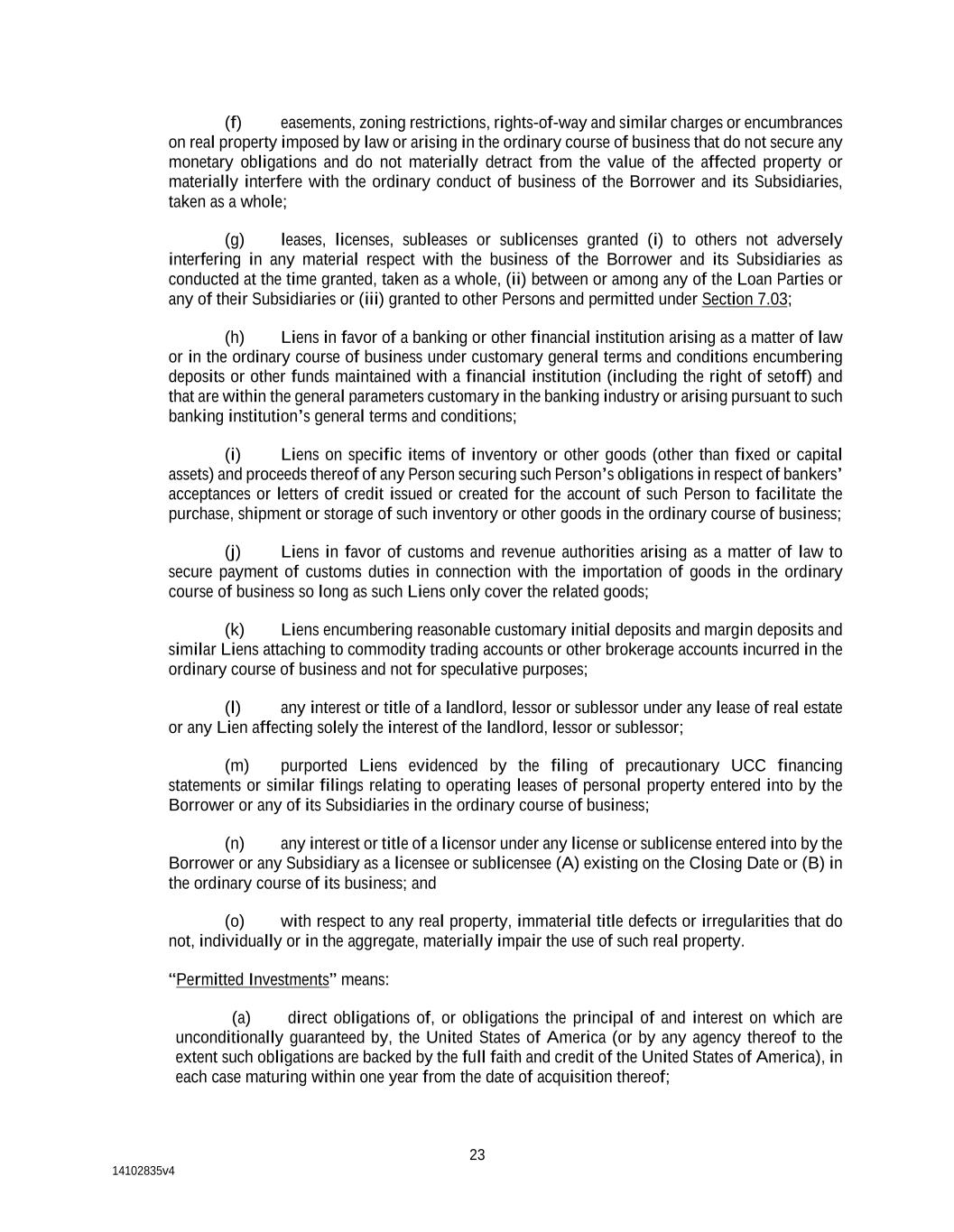 23 14102835v4 (f) easements, zoning restrictions, rights-of-way and similar charges or encumbrances on real property imposed by law or arising in the ordinary course of business that do not secure any monetary obligations and do not materially detract from the value of the affected property or materially interfere with the ordinary conduct of business of the Borrower and its Subsidiaries, taken as a whole; (g) leases, licenses, subleases or sublicenses granted (i) to others not adversely interfering in any material respect with the business of the Borrower and its Subsidiaries as conducted at the time granted, taken as a whole, (ii) between or among any of the Loan Parties or any of their Subsidiaries or (iii) granted to other Persons and permitted under Section 7.03; (h) Liens in favor of a banking or other financial institution arising as a matter of law or in the ordinary course of business under customary general terms and conditions encumbering deposits or other funds maintained with a financial institution (including the right of setoff) and that are within the general parameters customary in the banking industry or arising pursuant to such banking institution’s general terms and conditions; (i) Liens on specific items of inventory or other goods (other than fixed or capital assets) and proceeds thereof of any Person securing such Person’s obligations in respect of bankers’ acceptances or letters of credit issued or created for the account of such Person to facilitate the purchase, shipment or storage of such inventory or other goods in the ordinary course of business; (j) Liens in favor of customs and revenue authorities arising as a matter of law to secure payment of customs duties in connection with the importation of goods in the ordinary course of business so long as such Liens only cover the related goods; (k) Liens encumbering reasonable customary initial deposits and margin deposits and similar Liens attaching to commodity trading accounts or other brokerage accounts incurred in the ordinary course of business and not for speculative purposes; (l) any interest or title of a landlord, lessor or sublessor under any lease of real estate or any Lien affecting solely the interest of the landlord, lessor or sublessor; (m) purported Liens evidenced by the filing of precautionary UCC financing statements or similar filings relating to operating leases of personal property entered into by the Borrower or any of its Subsidiaries in the ordinary course of business; (n) any interest or title of a licensor under any license or sublicense entered into by the Borrower or any Subsidiary as a licensee or sublicensee (A) existing on the Closing Date or (B) in the ordinary course of its business; and (o) with respect to any real property, immaterial title defects or irregularities that do not, individually or in the aggregate, materially impair the use of such real property. “Permitted Investments” means: (a) direct obligations of, or obligations the principal of and interest on which are unconditionally guaranteed by, the United States of America (or by any agency thereof to the extent such obligations are backed by the full faith and credit of the United States of America), in each case maturing within one year from the date of acquisition thereof;