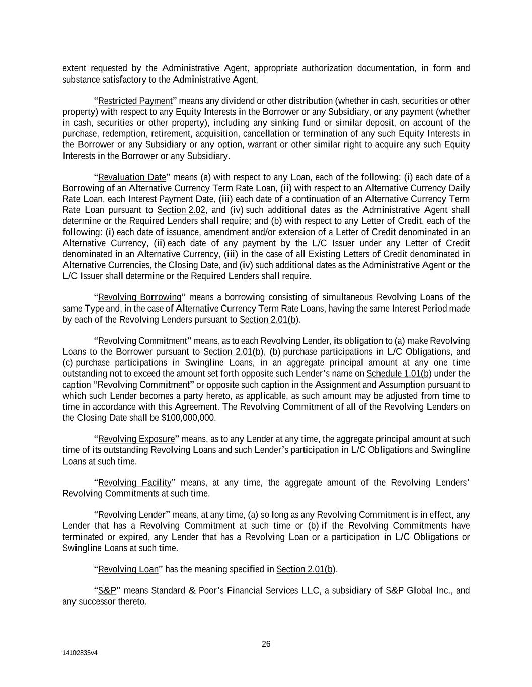 26 14102835v4 extent requested by the Administrative Agent, appropriate authorization documentation, in form and substance satisfactory to the Administrative Agent. “Restricted Payment” means any dividend or other distribution (whether in cash, securities or other property) with respect to any Equity Interests in the Borrower or any Subsidiary, or any payment (whether in cash, securities or other property), including any sinking fund or similar deposit, on account of the purchase, redemption, retirement, acquisition, cancellation or termination of any such Equity Interests in the Borrower or any Subsidiary or any option, warrant or other similar right to acquire any such Equity Interests in the Borrower or any Subsidiary. “Revaluation Date” means (a) with respect to any Loan, each of the following: (i) each date of a Borrowing of an Alternative Currency Term Rate Loan, (ii) with respect to an Alternative Currency Daily Rate Loan, each Interest Payment Date, (iii) each date of a continuation of an Alternative Currency Term Rate Loan pursuant to Section 2.02, and (iv) such additional dates as the Administrative Agent shall determine or the Required Lenders shall require; and (b) with respect to any Letter of Credit, each of the following: (i) each date of issuance, amendment and/or extension of a Letter of Credit denominated in an Alternative Currency, (ii) each date of any payment by the L/C Issuer under any Letter of Credit denominated in an Alternative Currency, (iii) in the case of all Existing Letters of Credit denominated in Alternative Currencies, the Closing Date, and (iv) such additional dates as the Administrative Agent or the L/C Issuer shall determine or the Required Lenders shall require. “Revolving Borrowing” means a borrowing consisting of simultaneous Revolving Loans of the same Type and, in the case of Alternative Currency Term Rate Loans, having the same Interest Period made by each of the Revolving Lenders pursuant to Section 2.01(b). “Revolving Commitment” means, as to each Revolving Lender, its obligation to (a) make Revolving Loans to the Borrower pursuant to Section 2.01(b), (b) purchase participations in L/C Obligations, and (c) purchase participations in Swingline Loans, in an aggregate principal amount at any one time outstanding not to exceed the amount set forth opposite such Lender’s name on Schedule 1.01(b) under the caption “Revolving Commitment” or opposite such caption in the Assignment and Assumption pursuant to which such Lender becomes a party hereto, as applicable, as such amount may be adjusted from time to time in accordance with this Agreement. The Revolving Commitment of all of the Revolving Lenders on the Closing Date shall be $100,000,000. “Revolving Exposure” means, as to any Lender at any time, the aggregate principal amount at such time of its outstanding Revolving Loans and such Lender’s participation in L/C Obligations and Swingline Loans at such time. “Revolving Facility” means, at any time, the aggregate amount of the Revolving Lenders’ Revolving Commitments at such time. “Revolving Lender” means, at any time, (a) so long as any Revolving Commitment is in effect, any Lender that has a Revolving Commitment at such time or (b) if the Revolving Commitments have terminated or expired, any Lender that has a Revolving Loan or a participation in L/C Obligations or Swingline Loans at such time. “Revolving Loan” has the meaning specified in Section 2.01(b). “S&P” means Standard & Poor’s Financial Services LLC, a subsidiary of S&P Global Inc., and any successor thereto.