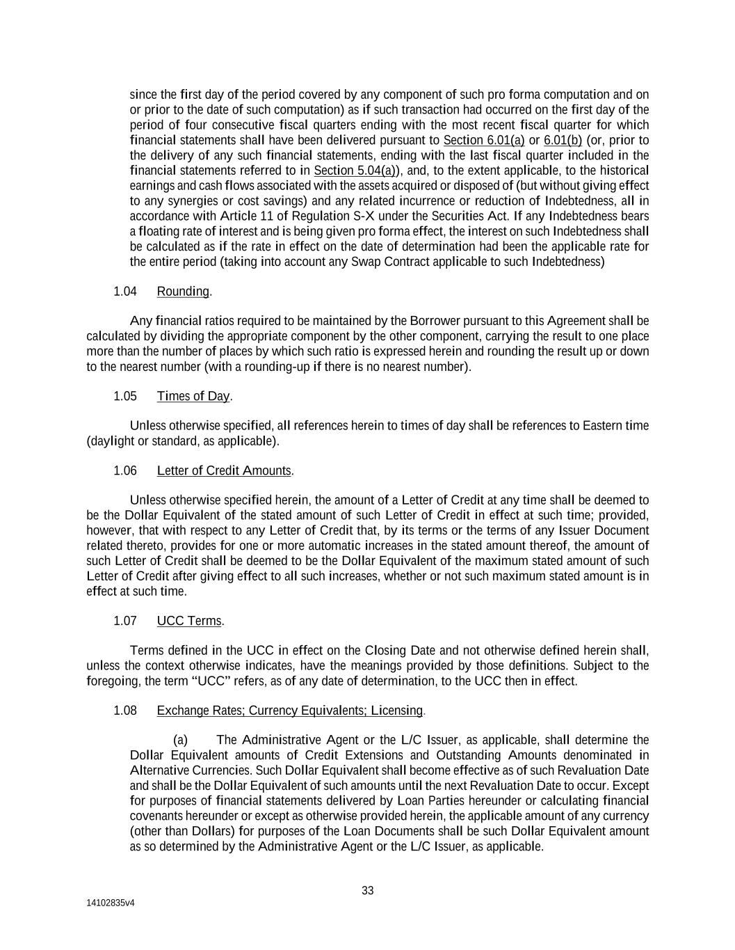 33 14102835v4 since the first day of the period covered by any component of such pro forma computation and on or prior to the date of such computation) as if such transaction had occurred on the first day of the period of four consecutive fiscal quarters ending with the most recent fiscal quarter for which financial statements shall have been delivered pursuant to Section 6.01(a) or 6.01(b) (or, prior to the delivery of any such financial statements, ending with the last fiscal quarter included in the financial statements referred to in Section 5.04(a)), and, to the extent applicable, to the historical earnings and cash flows associated with the assets acquired or disposed of (but without giving effect to any synergies or cost savings) and any related incurrence or reduction of Indebtedness, all in accordance with Article 11 of Regulation S-X under the Securities Act. If any Indebtedness bears a floating rate of interest and is being given pro forma effect, the interest on such Indebtedness shall be calculated as if the rate in effect on the date of determination had been the applicable rate for the entire period (taking into account any Swap Contract applicable to such Indebtedness) 1.04 Rounding. Any financial ratios required to be maintained by the Borrower pursuant to this Agreement shall be calculated by dividing the appropriate component by the other component, carrying the result to one place more than the number of places by which such ratio is expressed herein and rounding the result up or down to the nearest number (with a rounding-up if there is no nearest number). 1.05 Times of Day. Unless otherwise specified, all references herein to times of day shall be references to Eastern time (daylight or standard, as applicable). 1.06 Letter of Credit Amounts. Unless otherwise specified herein, the amount of a Letter of Credit at any time shall be deemed to be the Dollar Equivalent of the stated amount of such Letter of Credit in effect at such time; provided, however, that with respect to any Letter of Credit that, by its terms or the terms of any Issuer Document related thereto, provides for one or more automatic increases in the stated amount thereof, the amount of such Letter of Credit shall be deemed to be the Dollar Equivalent of the maximum stated amount of such Letter of Credit after giving effect to all such increases, whether or not such maximum stated amount is in effect at such time. 1.07 UCC Terms. Terms defined in the UCC in effect on the Closing Date and not otherwise defined herein shall, unless the context otherwise indicates, have the meanings provided by those definitions. Subject to the foregoing, the term “UCC” refers, as of any date of determination, to the UCC then in effect. 1.08 Exchange Rates; Currency Equivalents; Licensing. (a) The Administrative Agent or the L/C Issuer, as applicable, shall determine the Dollar Equivalent amounts of Credit Extensions and Outstanding Amounts denominated in Alternative Currencies. Such Dollar Equivalent shall become effective as of such Revaluation Date and shall be the Dollar Equivalent of such amounts until the next Revaluation Date to occur. Except for purposes of financial statements delivered by Loan Parties hereunder or calculating financial covenants hereunder or except as otherwise provided herein, the applicable amount of any currency (other than Dollars) for purposes of the Loan Documents shall be such Dollar Equivalent amount as so determined by the Administrative Agent or the L/C Issuer, as applicable.