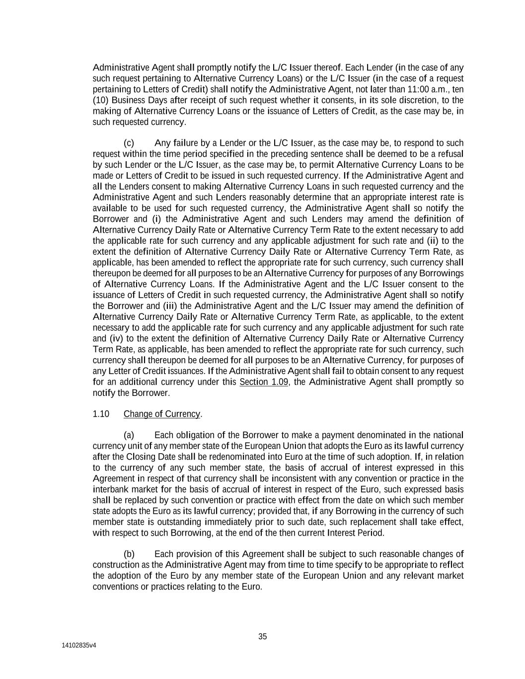 35 14102835v4 Administrative Agent shall promptly notify the L/C Issuer thereof. Each Lender (in the case of any such request pertaining to Alternative Currency Loans) or the L/C Issuer (in the case of a request pertaining to Letters of Credit) shall notify the Administrative Agent, not later than 11:00 a.m., ten (10) Business Days after receipt of such request whether it consents, in its sole discretion, to the making of Alternative Currency Loans or the issuance of Letters of Credit, as the case may be, in such requested currency. (c) Any failure by a Lender or the L/C Issuer, as the case may be, to respond to such request within the time period specified in the preceding sentence shall be deemed to be a refusal by such Lender or the L/C Issuer, as the case may be, to permit Alternative Currency Loans to be made or Letters of Credit to be issued in such requested currency. If the Administrative Agent and all the Lenders consent to making Alternative Currency Loans in such requested currency and the Administrative Agent and such Lenders reasonably determine that an appropriate interest rate is available to be used for such requested currency, the Administrative Agent shall so notify the Borrower and (i) the Administrative Agent and such Lenders may amend the definition of Alternative Currency Daily Rate or Alternative Currency Term Rate to the extent necessary to add the applicable rate for such currency and any applicable adjustment for such rate and (ii) to the extent the definition of Alternative Currency Daily Rate or Alternative Currency Term Rate, as applicable, has been amended to reflect the appropriate rate for such currency, such currency shall thereupon be deemed for all purposes to be an Alternative Currency for purposes of any Borrowings of Alternative Currency Loans. If the Administrative Agent and the L/C Issuer consent to the issuance of Letters of Credit in such requested currency, the Administrative Agent shall so notify the Borrower and (iii) the Administrative Agent and the L/C Issuer may amend the definition of Alternative Currency Daily Rate or Alternative Currency Term Rate, as applicable, to the extent necessary to add the applicable rate for such currency and any applicable adjustment for such rate and (iv) to the extent the definition of Alternative Currency Daily Rate or Alternative Currency Term Rate, as applicable, has been amended to reflect the appropriate rate for such currency, such currency shall thereupon be deemed for all purposes to be an Alternative Currency, for purposes of any Letter of Credit issuances. If the Administrative Agent shall fail to obtain consent to any request for an additional currency under this Section 1.09, the Administrative Agent shall promptly so notify the Borrower. 1.10 Change of Currency. (a) Each obligation of the Borrower to make a payment denominated in the national currency unit of any member state of the European Union that adopts the Euro as its lawful currency after the Closing Date shall be redenominated into Euro at the time of such adoption. If, in relation to the currency of any such member state, the basis of accrual of interest expressed in this Agreement in respect of that currency shall be inconsistent with any convention or practice in the interbank market for the basis of accrual of interest in respect of the Euro, such expressed basis shall be replaced by such convention or practice with effect from the date on which such member state adopts the Euro as its lawful currency; provided that, if any Borrowing in the currency of such member state is outstanding immediately prior to such date, such replacement shall take effect, with respect to such Borrowing, at the end of the then current Interest Period. (b) Each provision of this Agreement shall be subject to such reasonable changes of construction as the Administrative Agent may from time to time specify to be appropriate to reflect the adoption of the Euro by any member state of the European Union and any relevant market conventions or practices relating to the Euro.