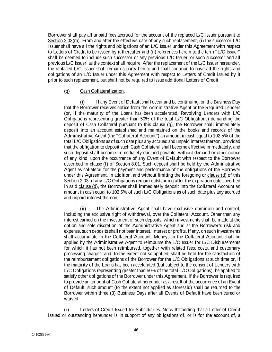 46 14102835v4 Borrower shall pay all unpaid fees accrued for the account of the replaced L/C Issuer pursuant to Section 2.03(m). From and after the effective date of any such replacement, (i) the successor L/C Issuer shall have all the rights and obligations of an L/C Issuer under this Agreement with respect to Letters of Credit to be issued by it thereafter and (ii) references herein to the term “L/C Issuer” shall be deemed to include such successor or any previous L/C Issuer, or such successor and all previous L/C Issuer, as the context shall require. After the replacement of the L/C Issuer hereunder, the replaced L/C Issuer shall remain a party hereto and shall continue to have all the rights and obligations of an L/C Issuer under this Agreement with respect to Letters of Credit issued by it prior to such replacement, but shall not be required to issue additional Letters of Credit. (q) Cash Collateralization. (i) If any Event of Default shall occur and be continuing, on the Business Day that the Borrower receives notice from the Administrative Agent or the Required Lenders (or, if the maturity of the Loans has been accelerated, Revolving Lenders with L/C Obligations representing greater than 50% of the total L/C Obligations) demanding the deposit of Cash Collateral pursuant to this clause (q), the Borrower shall immediately deposit into an account established and maintained on the books and records of the Administrative Agent (the “Collateral Account”) an amount in cash equal to 102.5% of the total L/C Obligations as of such date plus any accrued and unpaid interest thereon, provided that the obligation to deposit such Cash Collateral shall become effective immediately, and such deposit shall become immediately due and payable, without demand or other notice of any kind, upon the occurrence of any Event of Default with respect to the Borrower described in clause (f) of Section 8.01. Such deposit shall be held by the Administrative Agent as collateral for the payment and performance of the obligations of the Borrower under this Agreement. In addition, and without limiting the foregoing or clause (d) of this Section 2.03, if any L/C Obligations remain outstanding after the expiration date specified in said clause (d), the Borrower shall immediately deposit into the Collateral Account an amount in cash equal to 102.5% of such L/C Obligations as of such date plus any accrued and unpaid interest thereon. (ii) The Administrative Agent shall have exclusive dominion and control, including the exclusive right of withdrawal, over the Collateral Account. Other than any interest earned on the investment of such deposits, which investments shall be made at the option and sole discretion of the Administrative Agent and at the Borrower’s risk and expense, such deposits shall not bear interest. Interest or profits, if any, on such investments shall accumulate in the Collateral Account. Moneys in the Collateral Account shall be applied by the Administrative Agent to reimburse the L/C Issuer for L/C Disbursements for which it has not been reimbursed, together with related fees, costs, and customary processing charges, and, to the extent not so applied, shall be held for the satisfaction of the reimbursement obligations of the Borrower for the L/C Obligations at such time or, if the maturity of the Loans has been accelerated (but subject to the consent of Lenders with L/C Obligations representing greater than 50% of the total L/C Obligations), be applied to satisfy other obligations of the Borrower under this Agreement. If the Borrower is required to provide an amount of Cash Collateral hereunder as a result of the occurrence of an Event of Default, such amount (to the extent not applied as aforesaid) shall be returned to the Borrower within three (3) Business Days after all Events of Default have been cured or waived. (r) Letters of Credit Issued for Subsidiaries. Notwithstanding that a Letter of Credit issued or outstanding hereunder is in support of any obligations of, or is for the account of, a