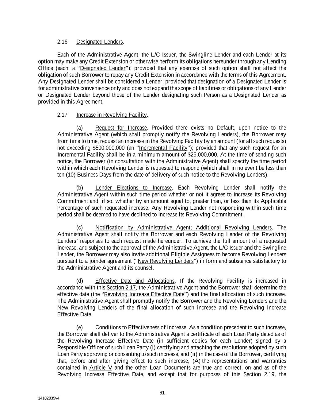 61 14102835v4 2.16 Designated Lenders. Each of the Administrative Agent, the L/C Issuer, the Swingline Lender and each Lender at its option may make any Credit Extension or otherwise perform its obligations hereunder through any Lending Office (each, a “Designated Lender”); provided that any exercise of such option shall not affect the obligation of such Borrower to repay any Credit Extension in accordance with the terms of this Agreement. Any Designated Lender shall be considered a Lender; provided that designation of a Designated Lender is for administrative convenience only and does not expand the scope of liabilities or obligations of any Lender or Designated Lender beyond those of the Lender designating such Person as a Designated Lender as provided in this Agreement. 2.17 Increase in Revolving Facility. (a) Request for Increase. Provided there exists no Default, upon notice to the Administrative Agent (which shall promptly notify the Revolving Lenders), the Borrower may from time to time, request an increase in the Revolving Facility by an amount (for all such requests) not exceeding $500,000,000 (an “Incremental Facility”); provided that any such request for an Incremental Facility shall be in a minimum amount of $25,000,000. At the time of sending such notice, the Borrower (in consultation with the Administrative Agent) shall specify the time period within which each Revolving Lender is requested to respond (which shall in no event be less than ten (10) Business Days from the date of delivery of such notice to the Revolving Lenders). (b) Lender Elections to Increase. Each Revolving Lender shall notify the Administrative Agent within such time period whether or not it agrees to increase its Revolving Commitment and, if so, whether by an amount equal to, greater than, or less than its Applicable Percentage of such requested increase. Any Revolving Lender not responding within such time period shall be deemed to have declined to increase its Revolving Commitment. (c) Notification by Administrative Agent; Additional Revolving Lenders. The Administrative Agent shall notify the Borrower and each Revolving Lender of the Revolving Lenders’ responses to each request made hereunder. To achieve the full amount of a requested increase, and subject to the approval of the Administrative Agent, the L/C Issuer and the Swingline Lender, the Borrower may also invite additional Eligible Assignees to become Revolving Lenders pursuant to a joinder agreement (“New Revolving Lenders”) in form and substance satisfactory to the Administrative Agent and its counsel. (d) Effective Date and Allocations. If the Revolving Facility is increased in accordance with this Section 2.17, the Administrative Agent and the Borrower shall determine the effective date (the “Revolving Increase Effective Date”) and the final allocation of such increase. The Administrative Agent shall promptly notify the Borrower and the Revolving Lenders and the New Revolving Lenders of the final allocation of such increase and the Revolving Increase Effective Date. (e) Conditions to Effectiveness of Increase. As a condition precedent to such increase, the Borrower shall deliver to the Administrative Agent a certificate of each Loan Party dated as of the Revolving Increase Effective Date (in sufficient copies for each Lender) signed by a Responsible Officer of such Loan Party (i) certifying and attaching the resolutions adopted by such Loan Party approving or consenting to such increase, and (ii) in the case of the Borrower, certifying that, before and after giving effect to such increase, (A) the representations and warranties contained in Article V and the other Loan Documents are true and correct, on and as of the Revolving Increase Effective Date, and except that for purposes of this Section 2.19, the