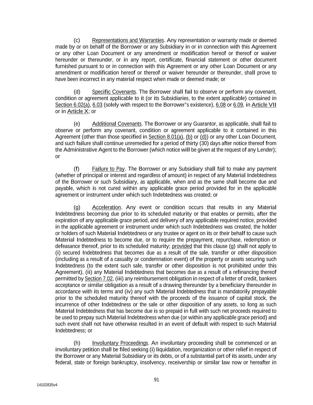 91 14102835v4 (c) Representations and Warranties. Any representation or warranty made or deemed made by or on behalf of the Borrower or any Subsidiary in or in connection with this Agreement or any other Loan Document or any amendment or modification hereof or thereof or waiver hereunder or thereunder, or in any report, certificate, financial statement or other document furnished pursuant to or in connection with this Agreement or any other Loan Document or any amendment or modification hereof or thereof or waiver hereunder or thereunder, shall prove to have been incorrect in any material respect when made or deemed made; or (d) Specific Covenants. The Borrower shall fail to observe or perform any covenant, condition or agreement applicable to it (or its Subsidiaries, to the extent applicable) contained in Section 6.02(a), 6.03 (solely with respect to the Borrower’s existence), 6.08 or 6.09, in Article VII or in Article X; or (e) Additional Covenants. The Borrower or any Guarantor, as applicable, shall fail to observe or perform any covenant, condition or agreement applicable to it contained in this Agreement (other than those specified in Section 8.01(a), (b) or (d)) or any other Loan Document, and such failure shall continue unremedied for a period of thirty (30) days after notice thereof from the Administrative Agent to the Borrower (which notice will be given at the request of any Lender); or (f) Failure to Pay. The Borrower or any Subsidiary shall fail to make any payment (whether of principal or interest and regardless of amount) in respect of any Material Indebtedness of the Borrower or such Subsidiary, as applicable, when and as the same shall become due and payable, which is not cured within any applicable grace period provided for in the applicable agreement or instrument under which such Indebtedness was created; or (g) Acceleration. Any event or condition occurs that results in any Material Indebtedness becoming due prior to its scheduled maturity or that enables or permits, after the expiration of any applicable grace period, and delivery of any applicable required notice, provided in the applicable agreement or instrument under which such Indebtedness was created, the holder or holders of such Material Indebtedness or any trustee or agent on its or their behalf to cause such Material Indebtedness to become due, or to require the prepayment, repurchase, redemption or defeasance thereof, prior to its scheduled maturity; provided that this clause (g) shall not apply to (i) secured Indebtedness that becomes due as a result of the sale, transfer or other disposition (including as a result of a casualty or condemnation event) of the property or assets securing such Indebtedness (to the extent such sale, transfer or other disposition is not prohibited under this Agreement), (ii) any Material Indebtedness that becomes due as a result of a refinancing thereof permitted by Section 7.02, (iii) any reimbursement obligation in respect of a letter of credit, bankers acceptance or similar obligation as a result of a drawing thereunder by a beneficiary thereunder in accordance with its terms and (iv) any such Material Indebtedness that is mandatorily prepayable prior to the scheduled maturity thereof with the proceeds of the issuance of capital stock, the incurrence of other Indebtedness or the sale or other disposition of any assets, so long as such Material Indebtedness that has become due is so prepaid in full with such net proceeds required to be used to prepay such Material Indebtedness when due (or within any applicable grace period) and such event shall not have otherwise resulted in an event of default with respect to such Material Indebtedness; or (h) Involuntary Proceedings. An involuntary proceeding shall be commenced or an involuntary petition shall be filed seeking (i) liquidation, reorganization or other relief in respect of the Borrower or any Material Subsidiary or its debts, or of a substantial part of its assets, under any federal, state or foreign bankruptcy, insolvency, receivership or similar law now or hereafter in