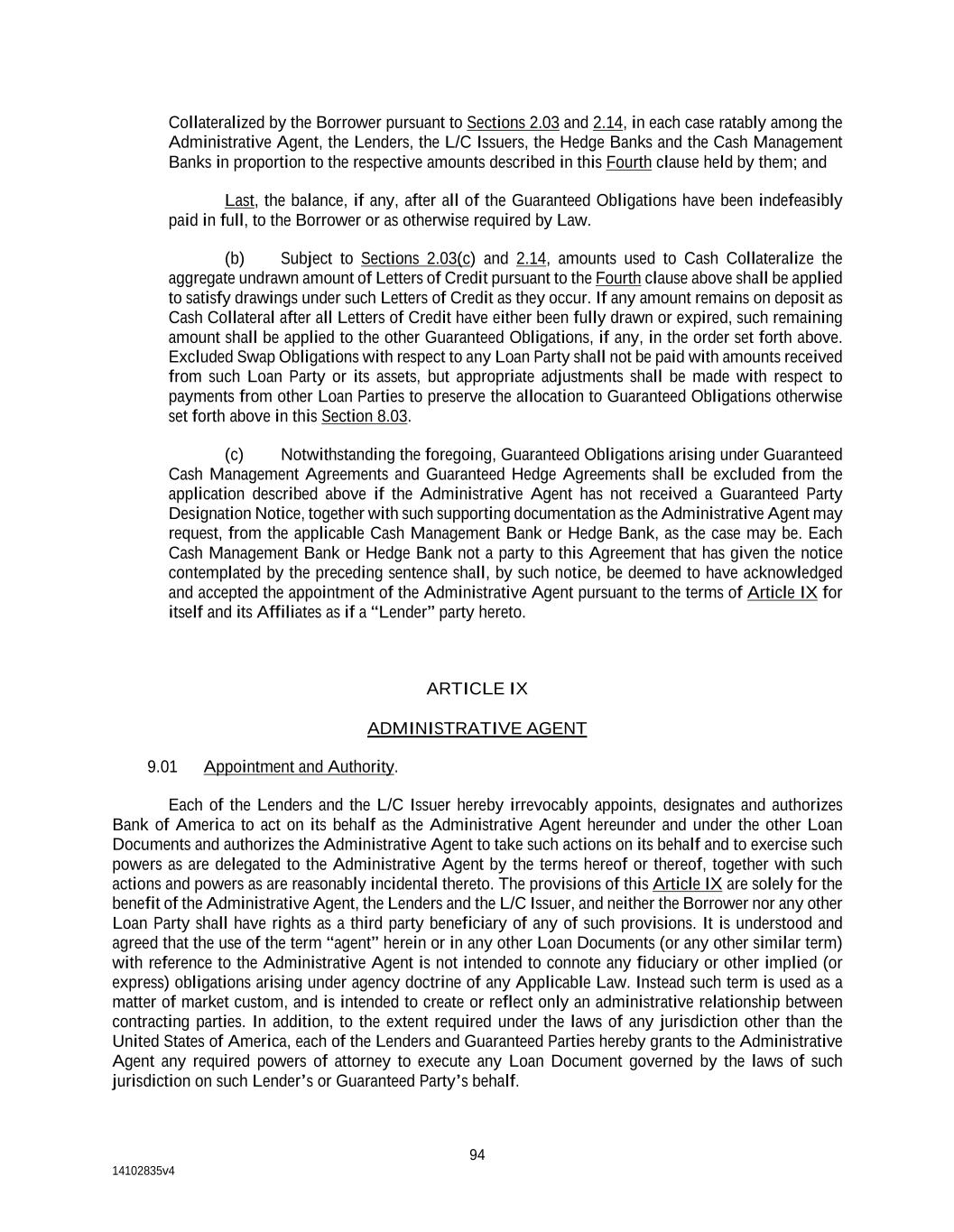 94 14102835v4 Collateralized by the Borrower pursuant to Sections 2.03 and 2.14, in each case ratably among the Administrative Agent, the Lenders, the L/C Issuers, the Hedge Banks and the Cash Management Banks in proportion to the respective amounts described in this Fourth clause held by them; and Last, the balance, if any, after all of the Guaranteed Obligations have been indefeasibly paid in full, to the Borrower or as otherwise required by Law. (b) Subject to Sections 2.03(c) and 2.14, amounts used to Cash Collateralize the aggregate undrawn amount of Letters of Credit pursuant to the Fourth clause above shall be applied to satisfy drawings under such Letters of Credit as they occur. If any amount remains on deposit as Cash Collateral after all Letters of Credit have either been fully drawn or expired, such remaining amount shall be applied to the other Guaranteed Obligations, if any, in the order set forth above. Excluded Swap Obligations with respect to any Loan Party shall not be paid with amounts received from such Loan Party or its assets, but appropriate adjustments shall be made with respect to payments from other Loan Parties to preserve the allocation to Guaranteed Obligations otherwise set forth above in this Section 8.03. (c) Notwithstanding the foregoing, Guaranteed Obligations arising under Guaranteed Cash Management Agreements and Guaranteed Hedge Agreements shall be excluded from the application described above if the Administrative Agent has not received a Guaranteed Party Designation Notice, together with such supporting documentation as the Administrative Agent may request, from the applicable Cash Management Bank or Hedge Bank, as the case may be. Each Cash Management Bank or Hedge Bank not a party to this Agreement that has given the notice contemplated by the preceding sentence shall, by such notice, be deemed to have acknowledged and accepted the appointment of the Administrative Agent pursuant to the terms of Article IX for itself and its Affiliates as if a “Lender” party hereto. ARTICLE IX ADMINISTRATIVE AGENT 9.01 Appointment and Authority. Each of the Lenders and the L/C Issuer hereby irrevocably appoints, designates and authorizes Bank of America to act on its behalf as the Administrative Agent hereunder and under the other Loan Documents and authorizes the Administrative Agent to take such actions on its behalf and to exercise such powers as are delegated to the Administrative Agent by the terms hereof or thereof, together with such actions and powers as are reasonably incidental thereto. The provisions of this Article IX are solely for the benefit of the Administrative Agent, the Lenders and the L/C Issuer, and neither the Borrower nor any other Loan Party shall have rights as a third party beneficiary of any of such provisions. It is understood and agreed that the use of the term “agent” herein or in any other Loan Documents (or any other similar term) with reference to the Administrative Agent is not intended to connote any fiduciary or other implied (or express) obligations arising under agency doctrine of any Applicable Law. Instead such term is used as a matter of market custom, and is intended to create or reflect only an administrative relationship between contracting parties. In addition, to the extent required under the laws of any jurisdiction other than the United States of America, each of the Lenders and Guaranteed Parties hereby grants to the Administrative Agent any required powers of attorney to execute any Loan Document governed by the laws of such jurisdiction on such Lender’s or Guaranteed Party’s behalf.