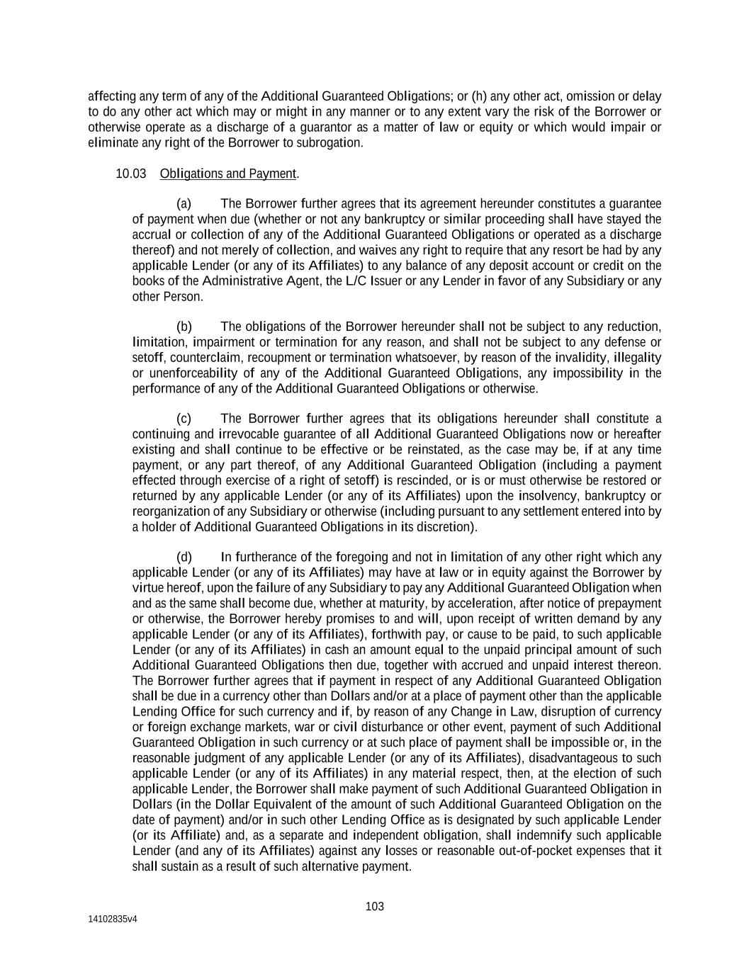 103 14102835v4 affecting any term of any of the Additional Guaranteed Obligations; or (h) any other act, omission or delay to do any other act which may or might in any manner or to any extent vary the risk of the Borrower or otherwise operate as a discharge of a guarantor as a matter of law or equity or which would impair or eliminate any right of the Borrower to subrogation. 10.03 Obligations and Payment. (a) The Borrower further agrees that its agreement hereunder constitutes a guarantee of payment when due (whether or not any bankruptcy or similar proceeding shall have stayed the accrual or collection of any of the Additional Guaranteed Obligations or operated as a discharge thereof) and not merely of collection, and waives any right to require that any resort be had by any applicable Lender (or any of its Affiliates) to any balance of any deposit account or credit on the books of the Administrative Agent, the L/C Issuer or any Lender in favor of any Subsidiary or any other Person. (b) The obligations of the Borrower hereunder shall not be subject to any reduction, limitation, impairment or termination for any reason, and shall not be subject to any defense or setoff, counterclaim, recoupment or termination whatsoever, by reason of the invalidity, illegality or unenforceability of any of the Additional Guaranteed Obligations, any impossibility in the performance of any of the Additional Guaranteed Obligations or otherwise. (c) The Borrower further agrees that its obligations hereunder shall constitute a continuing and irrevocable guarantee of all Additional Guaranteed Obligations now or hereafter existing and shall continue to be effective or be reinstated, as the case may be, if at any time payment, or any part thereof, of any Additional Guaranteed Obligation (including a payment effected through exercise of a right of setoff) is rescinded, or is or must otherwise be restored or returned by any applicable Lender (or any of its Affiliates) upon the insolvency, bankruptcy or reorganization of any Subsidiary or otherwise (including pursuant to any settlement entered into by a holder of Additional Guaranteed Obligations in its discretion). (d) In furtherance of the foregoing and not in limitation of any other right which any applicable Lender (or any of its Affiliates) may have at law or in equity against the Borrower by virtue hereof, upon the failure of any Subsidiary to pay any Additional Guaranteed Obligation when and as the same shall become due, whether at maturity, by acceleration, after notice of prepayment or otherwise, the Borrower hereby promises to and will, upon receipt of written demand by any applicable Lender (or any of its Affiliates), forthwith pay, or cause to be paid, to such applicable Lender (or any of its Affiliates) in cash an amount equal to the unpaid principal amount of such Additional Guaranteed Obligations then due, together with accrued and unpaid interest thereon. The Borrower further agrees that if payment in respect of any Additional Guaranteed Obligation shall be due in a currency other than Dollars and/or at a place of payment other than the applicable Lending Office for such currency and if, by reason of any Change in Law, disruption of currency or foreign exchange markets, war or civil disturbance or other event, payment of such Additional Guaranteed Obligation in such currency or at such place of payment shall be impossible or, in the reasonable judgment of any applicable Lender (or any of its Affiliates), disadvantageous to such applicable Lender (or any of its Affiliates) in any material respect, then, at the election of such applicable Lender, the Borrower shall make payment of such Additional Guaranteed Obligation in Dollars (in the Dollar Equivalent of the amount of such Additional Guaranteed Obligation on the date of payment) and/or in such other Lending Office as is designated by such applicable Lender (or its Affiliate) and, as a separate and independent obligation, shall indemnify such applicable Lender (and any of its Affiliates) against any losses or reasonable out-of-pocket expenses that it shall sustain as a result of such alternative payment.