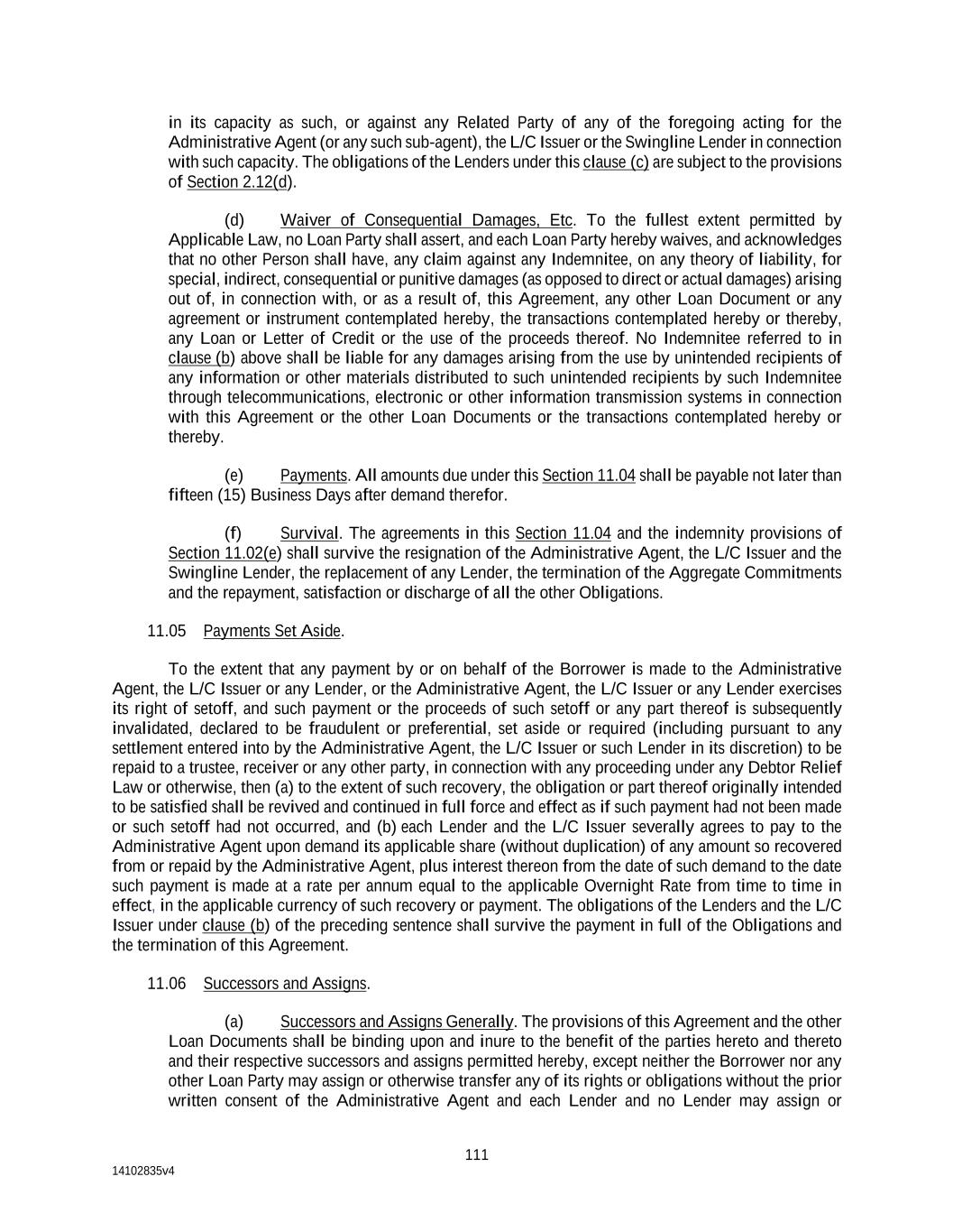 111 14102835v4 in its capacity as such, or against any Related Party of any of the foregoing acting for the Administrative Agent (or any such sub-agent), the L/C Issuer or the Swingline Lender in connection with such capacity. The obligations of the Lenders under this clause (c) are subject to the provisions of Section 2.12(d). (d) Waiver of Consequential Damages, Etc. To the fullest extent permitted by Applicable Law, no Loan Party shall assert, and each Loan Party hereby waives, and acknowledges that no other Person shall have, any claim against any Indemnitee, on any theory of liability, for special, indirect, consequential or punitive damages (as opposed to direct or actual damages) arising out of, in connection with, or as a result of, this Agreement, any other Loan Document or any agreement or instrument contemplated hereby, the transactions contemplated hereby or thereby, any Loan or Letter of Credit or the use of the proceeds thereof. No Indemnitee referred to in clause (b) above shall be liable for any damages arising from the use by unintended recipients of any information or other materials distributed to such unintended recipients by such Indemnitee through telecommunications, electronic or other information transmission systems in connection with this Agreement or the other Loan Documents or the transactions contemplated hereby or thereby. (e) Payments. All amounts due under this Section 11.04 shall be payable not later than fifteen (15) Business Days after demand therefor. (f) Survival. The agreements in this Section 11.04 and the indemnity provisions of Section 11.02(e) shall survive the resignation of the Administrative Agent, the L/C Issuer and the Swingline Lender, the replacement of any Lender, the termination of the Aggregate Commitments and the repayment, satisfaction or discharge of all the other Obligations. 11.05 Payments Set Aside. To the extent that any payment by or on behalf of the Borrower is made to the Administrative Agent, the L/C Issuer or any Lender, or the Administrative Agent, the L/C Issuer or any Lender exercises its right of setoff, and such payment or the proceeds of such setoff or any part thereof is subsequently invalidated, declared to be fraudulent or preferential, set aside or required (including pursuant to any settlement entered into by the Administrative Agent, the L/C Issuer or such Lender in its discretion) to be repaid to a trustee, receiver or any other party, in connection with any proceeding under any Debtor Relief Law or otherwise, then (a) to the extent of such recovery, the obligation or part thereof originally intended to be satisfied shall be revived and continued in full force and effect as if such payment had not been made or such setoff had not occurred, and (b) each Lender and the L/C Issuer severally agrees to pay to the Administrative Agent upon demand its applicable share (without duplication) of any amount so recovered from or repaid by the Administrative Agent, plus interest thereon from the date of such demand to the date such payment is made at a rate per annum equal to the applicable Overnight Rate from time to time in effect, in the applicable currency of such recovery or payment. The obligations of the Lenders and the L/C Issuer under clause (b) of the preceding sentence shall survive the payment in full of the Obligations and the termination of this Agreement. 11.06 Successors and Assigns. (a) Successors and Assigns Generally. The provisions of this Agreement and the other Loan Documents shall be binding upon and inure to the benefit of the parties hereto and thereto and their respective successors and assigns permitted hereby, except neither the Borrower nor any other Loan Party may assign or otherwise transfer any of its rights or obligations without the prior written consent of the Administrative Agent and each Lender and no Lender may assign or