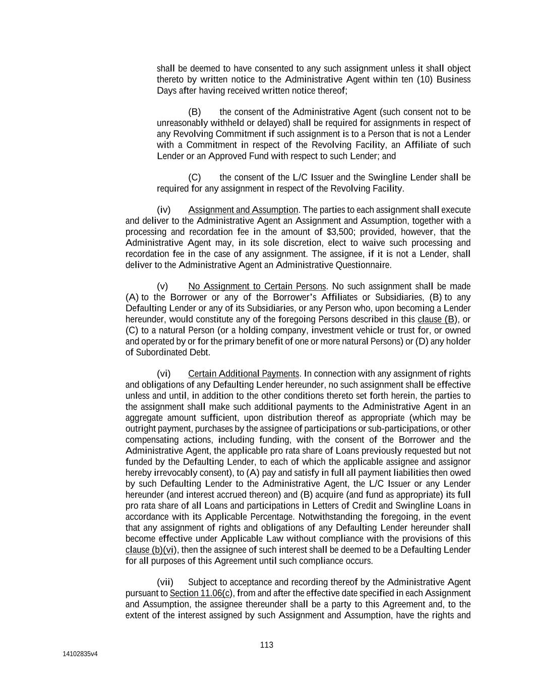 113 14102835v4 shall be deemed to have consented to any such assignment unless it shall object thereto by written notice to the Administrative Agent within ten (10) Business Days after having received written notice thereof; (B) the consent of the Administrative Agent (such consent not to be unreasonably withheld or delayed) shall be required for assignments in respect of any Revolving Commitment if such assignment is to a Person that is not a Lender with a Commitment in respect of the Revolving Facility, an Affiliate of such Lender or an Approved Fund with respect to such Lender; and (C) the consent of the L/C Issuer and the Swingline Lender shall be required for any assignment in respect of the Revolving Facility. (iv) Assignment and Assumption. The parties to each assignment shall execute and deliver to the Administrative Agent an Assignment and Assumption, together with a processing and recordation fee in the amount of $3,500; provided, however, that the Administrative Agent may, in its sole discretion, elect to waive such processing and recordation fee in the case of any assignment. The assignee, if it is not a Lender, shall deliver to the Administrative Agent an Administrative Questionnaire. (v) No Assignment to Certain Persons. No such assignment shall be made (A) to the Borrower or any of the Borrower’s Affiliates or Subsidiaries, (B) to any Defaulting Lender or any of its Subsidiaries, or any Person who, upon becoming a Lender hereunder, would constitute any of the foregoing Persons described in this clause (B), or (C) to a natural Person (or a holding company, investment vehicle or trust for, or owned and operated by or for the primary benefit of one or more natural Persons) or (D) any holder of Subordinated Debt. (vi) Certain Additional Payments. In connection with any assignment of rights and obligations of any Defaulting Lender hereunder, no such assignment shall be effective unless and until, in addition to the other conditions thereto set forth herein, the parties to the assignment shall make such additional payments to the Administrative Agent in an aggregate amount sufficient, upon distribution thereof as appropriate (which may be outright payment, purchases by the assignee of participations or sub-participations, or other compensating actions, including funding, with the consent of the Borrower and the Administrative Agent, the applicable pro rata share of Loans previously requested but not funded by the Defaulting Lender, to each of which the applicable assignee and assignor hereby irrevocably consent), to (A) pay and satisfy in full all payment liabilities then owed by such Defaulting Lender to the Administrative Agent, the L/C Issuer or any Lender hereunder (and interest accrued thereon) and (B) acquire (and fund as appropriate) its full pro rata share of all Loans and participations in Letters of Credit and Swingline Loans in accordance with its Applicable Percentage. Notwithstanding the foregoing, in the event that any assignment of rights and obligations of any Defaulting Lender hereunder shall become effective under Applicable Law without compliance with the provisions of this clause (b)(vi), then the assignee of such interest shall be deemed to be a Defaulting Lender for all purposes of this Agreement until such compliance occurs. (vii) Subject to acceptance and recording thereof by the Administrative Agent pursuant to Section 11.06(c), from and after the effective date specified in each Assignment and Assumption, the assignee thereunder shall be a party to this Agreement and, to the extent of the interest assigned by such Assignment and Assumption, have the rights and