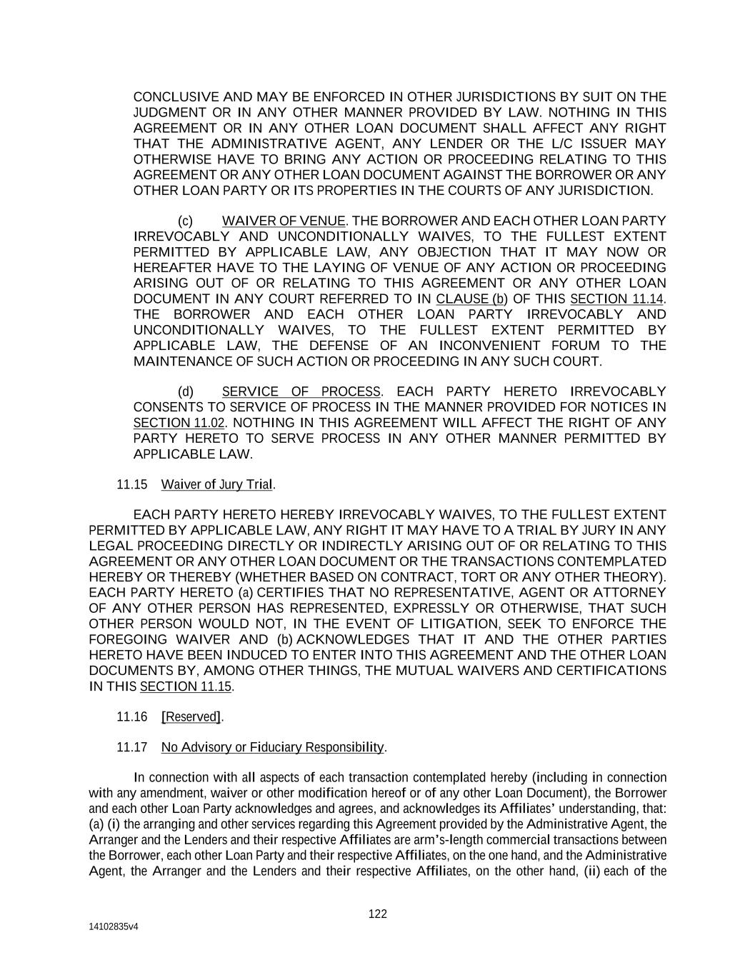 122 14102835v4 CONCLUSIVE AND MAY BE ENFORCED IN OTHER JURISDICTIONS BY SUIT ON THE JUDGMENT OR IN ANY OTHER MANNER PROVIDED BY LAW. NOTHING IN THIS AGREEMENT OR IN ANY OTHER LOAN DOCUMENT SHALL AFFECT ANY RIGHT THAT THE ADMINISTRATIVE AGENT, ANY LENDER OR THE L/C ISSUER MAY OTHERWISE HAVE TO BRING ANY ACTION OR PROCEEDING RELATING TO THIS AGREEMENT OR ANY OTHER LOAN DOCUMENT AGAINST THE BORROWER OR ANY OTHER LOAN PARTY OR ITS PROPERTIES IN THE COURTS OF ANY JURISDICTION. (c) WAIVER OF VENUE. THE BORROWER AND EACH OTHER LOAN PARTY IRREVOCABLY AND UNCONDITIONALLY WAIVES, TO THE FULLEST EXTENT PERMITTED BY APPLICABLE LAW, ANY OBJECTION THAT IT MAY NOW OR HEREAFTER HAVE TO THE LAYING OF VENUE OF ANY ACTION OR PROCEEDING ARISING OUT OF OR RELATING TO THIS AGREEMENT OR ANY OTHER LOAN DOCUMENT IN ANY COURT REFERRED TO IN CLAUSE (b) OF THIS SECTION 11.14. THE BORROWER AND EACH OTHER LOAN PARTY IRREVOCABLY AND UNCONDITIONALLY WAIVES, TO THE FULLEST EXTENT PERMITTED BY APPLICABLE LAW, THE DEFENSE OF AN INCONVENIENT FORUM TO THE MAINTENANCE OF SUCH ACTION OR PROCEEDING IN ANY SUCH COURT. (d) SERVICE OF PROCESS. EACH PARTY HERETO IRREVOCABLY CONSENTS TO SERVICE OF PROCESS IN THE MANNER PROVIDED FOR NOTICES IN SECTION 11.02. NOTHING IN THIS AGREEMENT WILL AFFECT THE RIGHT OF ANY PARTY HERETO TO SERVE PROCESS IN ANY OTHER MANNER PERMITTED BY APPLICABLE LAW. 11.15 Waiver of Jury Trial. EACH PARTY HERETO HEREBY IRREVOCABLY WAIVES, TO THE FULLEST EXTENT PERMITTED BY APPLICABLE LAW, ANY RIGHT IT MAY HAVE TO A TRIAL BY JURY IN ANY LEGAL PROCEEDING DIRECTLY OR INDIRECTLY ARISING OUT OF OR RELATING TO THIS AGREEMENT OR ANY OTHER LOAN DOCUMENT OR THE TRANSACTIONS CONTEMPLATED HEREBY OR THEREBY (WHETHER BASED ON CONTRACT, TORT OR ANY OTHER THEORY). EACH PARTY HERETO (a) CERTIFIES THAT NO REPRESENTATIVE, AGENT OR ATTORNEY OF ANY OTHER PERSON HAS REPRESENTED, EXPRESSLY OR OTHERWISE, THAT SUCH OTHER PERSON WOULD NOT, IN THE EVENT OF LITIGATION, SEEK TO ENFORCE THE FOREGOING WAIVER AND (b) ACKNOWLEDGES THAT IT AND THE OTHER PARTIES HERETO HAVE BEEN INDUCED TO ENTER INTO THIS AGREEMENT AND THE OTHER LOAN DOCUMENTS BY, AMONG OTHER THINGS, THE MUTUAL WAIVERS AND CERTIFICATIONS IN THIS SECTION 11.15. 11.16 [Reserved]. 11.17 No Advisory or Fiduciary Responsibility. In connection with all aspects of each transaction contemplated hereby (including in connection with any amendment, waiver or other modification hereof or of any other Loan Document), the Borrower and each other Loan Party acknowledges and agrees, and acknowledges its Affiliates’ understanding, that: (a) (i) the arranging and other services regarding this Agreement provided by the Administrative Agent, the Arranger and the Lenders and their respective Affiliates are arm’s-length commercial transactions between the Borrower, each other Loan Party and their respective Affiliates, on the one hand, and the Administrative Agent, the Arranger and the Lenders and their respective Affiliates, on the other hand, (ii) each of the