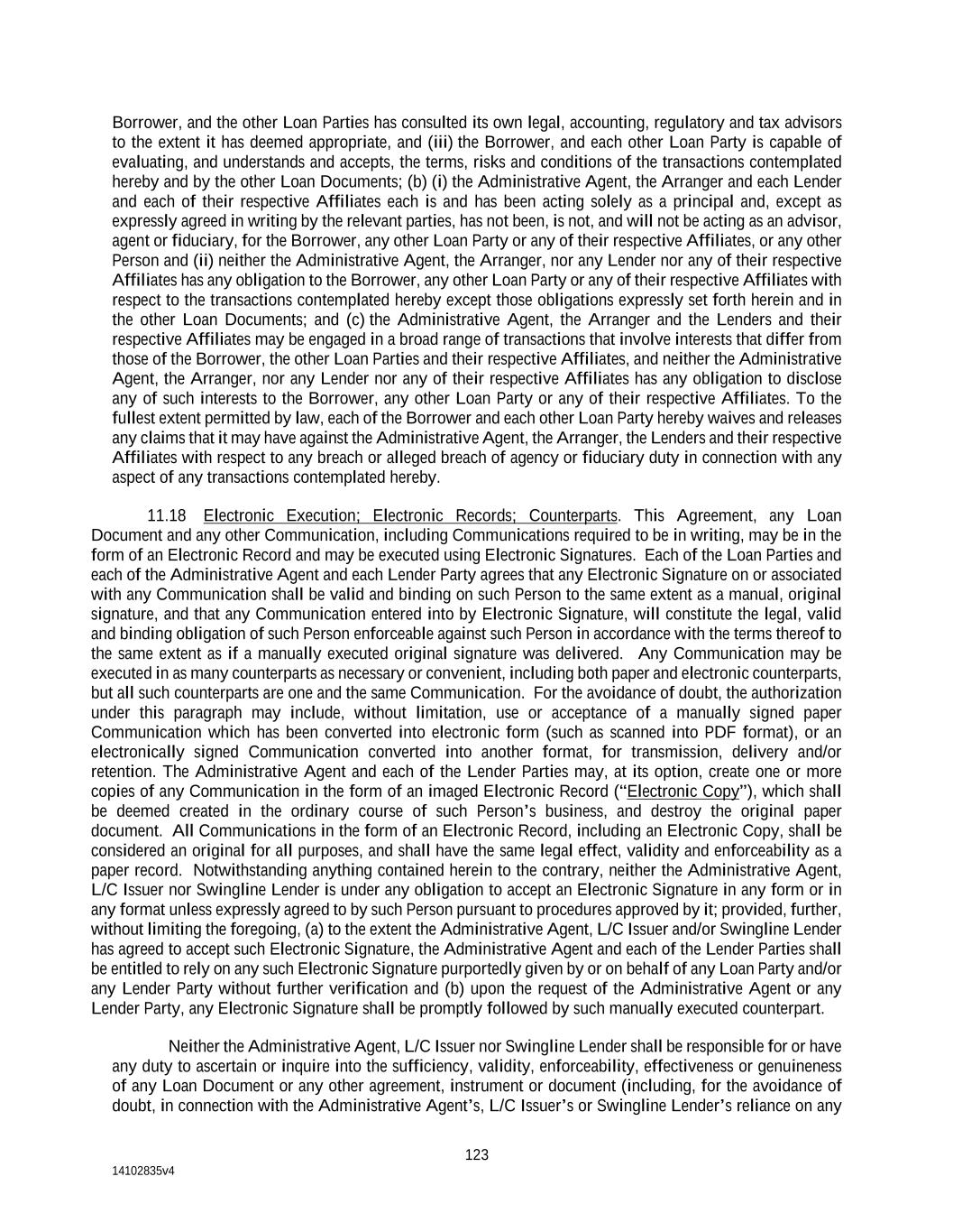 123 14102835v4 Borrower, and the other Loan Parties has consulted its own legal, accounting, regulatory and tax advisors to the extent it has deemed appropriate, and (iii) the Borrower, and each other Loan Party is capable of evaluating, and understands and accepts, the terms, risks and conditions of the transactions contemplated hereby and by the other Loan Documents; (b) (i) the Administrative Agent, the Arranger and each Lender and each of their respective Affiliates each is and has been acting solely as a principal and, except as expressly agreed in writing by the relevant parties, has not been, is not, and will not be acting as an advisor, agent or fiduciary, for the Borrower, any other Loan Party or any of their respective Affiliates, or any other Person and (ii) neither the Administrative Agent, the Arranger, nor any Lender nor any of their respective Affiliates has any obligation to the Borrower, any other Loan Party or any of their respective Affiliates with respect to the transactions contemplated hereby except those obligations expressly set forth herein and in the other Loan Documents; and (c) the Administrative Agent, the Arranger and the Lenders and their respective Affiliates may be engaged in a broad range of transactions that involve interests that differ from those of the Borrower, the other Loan Parties and their respective Affiliates, and neither the Administrative Agent, the Arranger, nor any Lender nor any of their respective Affiliates has any obligation to disclose any of such interests to the Borrower, any other Loan Party or any of their respective Affiliates. To the fullest extent permitted by law, each of the Borrower and each other Loan Party hereby waives and releases any claims that it may have against the Administrative Agent, the Arranger, the Lenders and their respective Affiliates with respect to any breach or alleged breach of agency or fiduciary duty in connection with any aspect of any transactions contemplated hereby. 11.18 Electronic Execution; Electronic Records; Counterparts. This Agreement, any Loan Document and any other Communication, including Communications required to be in writing, may be in the form of an Electronic Record and may be executed using Electronic Signatures. Each of the Loan Parties and each of the Administrative Agent and each Lender Party agrees that any Electronic Signature on or associated with any Communication shall be valid and binding on such Person to the same extent as a manual, original signature, and that any Communication entered into by Electronic Signature, will constitute the legal, valid and binding obligation of such Person enforceable against such Person in accordance with the terms thereof to the same extent as if a manually executed original signature was delivered. Any Communication may be executed in as many counterparts as necessary or convenient, including both paper and electronic counterparts, but all such counterparts are one and the same Communication. For the avoidance of doubt, the authorization under this paragraph may include, without limitation, use or acceptance of a manually signed paper Communication which has been converted into electronic form (such as scanned into PDF format), or an electronically signed Communication converted into another format, for transmission, delivery and/or retention. The Administrative Agent and each of the Lender Parties may, at its option, create one or more copies of any Communication in the form of an imaged Electronic Record (“Electronic Copy”), which shall be deemed created in the ordinary course of such Person’s business, and destroy the original paper document. All Communications in the form of an Electronic Record, including an Electronic Copy, shall be considered an original for all purposes, and shall have the same legal effect, validity and enforceability as a paper record. Notwithstanding anything contained herein to the contrary, neither the Administrative Agent, L/C Issuer nor Swingline Lender is under any obligation to accept an Electronic Signature in any form or in any format unless expressly agreed to by such Person pursuant to procedures approved by it; provided, further, without limiting the foregoing, (a) to the extent the Administrative Agent, L/C Issuer and/or Swingline Lender has agreed to accept such Electronic Signature, the Administrative Agent and each of the Lender Parties shall be entitled to rely on any such Electronic Signature purportedly given by or on behalf of any Loan Party and/or any Lender Party without further verification and (b) upon the request of the Administrative Agent or any Lender Party, any Electronic Signature shall be promptly followed by such manually executed counterpart. Neither the Administrative Agent, L/C Issuer nor Swingline Lender shall be responsible for or have any duty to ascertain or inquire into the sufficiency, validity, enforceability, effectiveness or genuineness of any Loan Document or any other agreement, instrument or document (including, for the avoidance of doubt, in connection with the Administrative Agent’s, L/C Issuer’s or Swingline Lender’s reliance on any