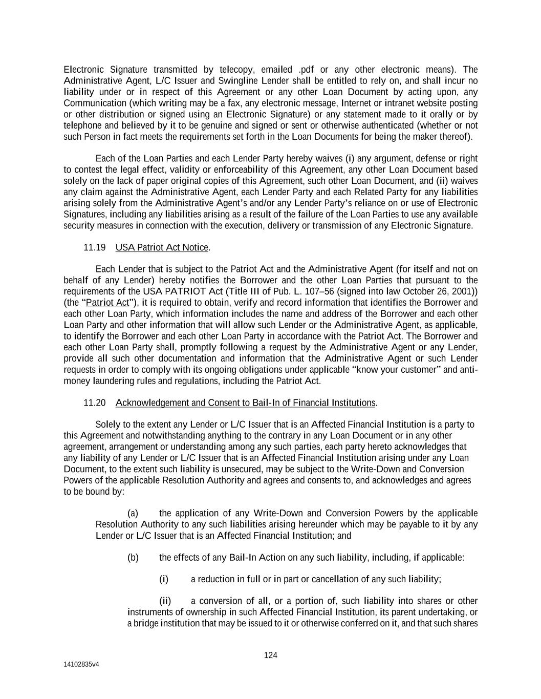 124 14102835v4 Electronic Signature transmitted by telecopy, emailed .pdf or any other electronic means). The Administrative Agent, L/C Issuer and Swingline Lender shall be entitled to rely on, and shall incur no liability under or in respect of this Agreement or any other Loan Document by acting upon, any Communication (which writing may be a fax, any electronic message, Internet or intranet website posting or other distribution or signed using an Electronic Signature) or any statement made to it orally or by telephone and believed by it to be genuine and signed or sent or otherwise authenticated (whether or not such Person in fact meets the requirements set forth in the Loan Documents for being the maker thereof). Each of the Loan Parties and each Lender Party hereby waives (i) any argument, defense or right to contest the legal effect, validity or enforceability of this Agreement, any other Loan Document based solely on the lack of paper original copies of this Agreement, such other Loan Document, and (ii) waives any claim against the Administrative Agent, each Lender Party and each Related Party for any liabilities arising solely from the Administrative Agent’s and/or any Lender Party’s reliance on or use of Electronic Signatures, including any liabilities arising as a result of the failure of the Loan Parties to use any available security measures in connection with the execution, delivery or transmission of any Electronic Signature. 11.19 USA Patriot Act Notice. Each Lender that is subject to the Patriot Act and the Administrative Agent (for itself and not on behalf of any Lender) hereby notifies the Borrower and the other Loan Parties that pursuant to the requirements of the USA PATRIOT Act (Title III of Pub. L. 107–56 (signed into law October 26, 2001)) (the “Patriot Act”), it is required to obtain, verify and record information that identifies the Borrower and each other Loan Party, which information includes the name and address of the Borrower and each other Loan Party and other information that will allow such Lender or the Administrative Agent, as applicable, to identify the Borrower and each other Loan Party in accordance with the Patriot Act. The Borrower and each other Loan Party shall, promptly following a request by the Administrative Agent or any Lender, provide all such other documentation and information that the Administrative Agent or such Lender requests in order to comply with its ongoing obligations under applicable “know your customer” and anti- money laundering rules and regulations, including the Patriot Act. 11.20 Acknowledgement and Consent to Bail-In of Financial Institutions. Solely to the extent any Lender or L/C Issuer that is an Affected Financial Institution is a party to this Agreement and notwithstanding anything to the contrary in any Loan Document or in any other agreement, arrangement or understanding among any such parties, each party hereto acknowledges that any liability of any Lender or L/C Issuer that is an Affected Financial Institution arising under any Loan Document, to the extent such liability is unsecured, may be subject to the Write-Down and Conversion Powers of the applicable Resolution Authority and agrees and consents to, and acknowledges and agrees to be bound by: (a) the application of any Write-Down and Conversion Powers by the applicable Resolution Authority to any such liabilities arising hereunder which may be payable to it by any Lender or L/C Issuer that is an Affected Financial Institution; and (b) the effects of any Bail-In Action on any such liability, including, if applicable: (i) a reduction in full or in part or cancellation of any such liability; (ii) a conversion of all, or a portion of, such liability into shares or other instruments of ownership in such Affected Financial Institution, its parent undertaking, or a bridge institution that may be issued to it or otherwise conferred on it, and that such shares