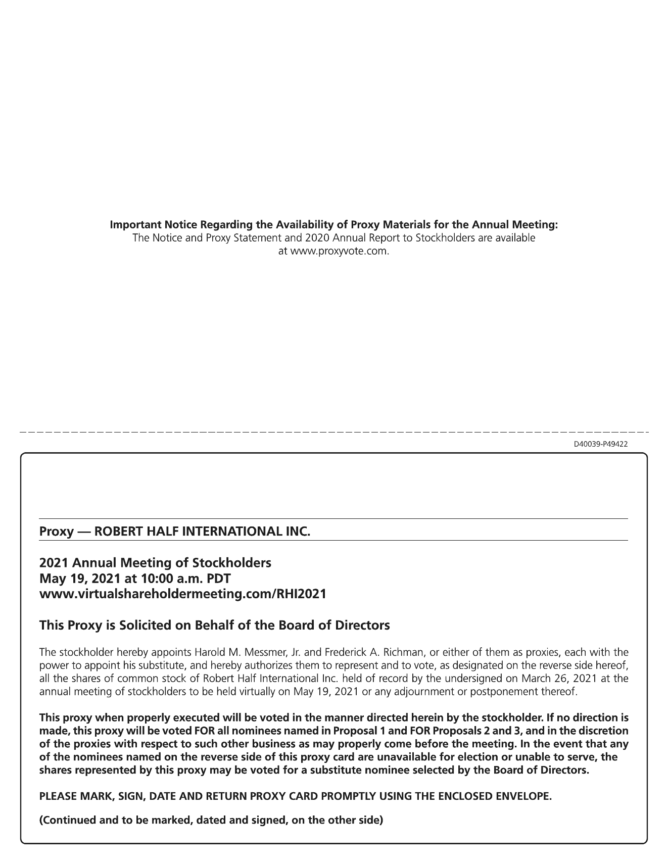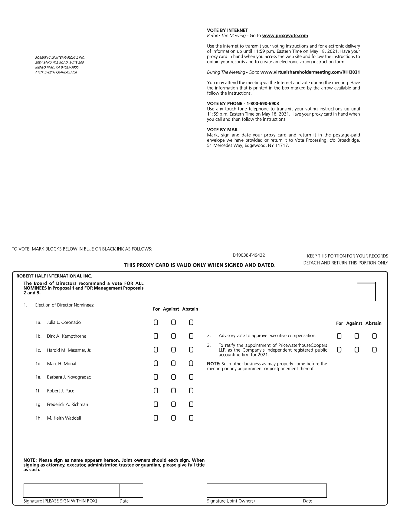 The Company’s global inclusion and diversity strategy is led by our Vice President, Employee Experience and Diversity, Equity and Inclusion (DEI) and an executive steering council. Together, they are responsible for identifying opportunities to increase cultural diversity and awareness and build a stronger sense of belonging among our employees. In 2020, Robert Half launched a global training for our Corporate Services employees and staffing professionals on recognizing unconscious bias and, Protiviti expanded its unconscious bias awareness training to include suggested actions for employees.