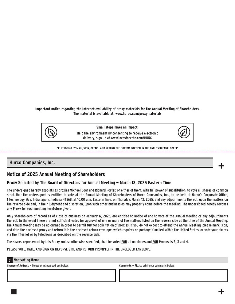 Important notice regarding the Internet availability of proxy materials for the Annual Meeting of Shareholders. The material is available at: www.hurco.com/proxy materials Small steps make an impact. Help the environment by consenting to receive electronic delivery, sign up at www.investorvote.com/HURC • IF VOTING BY MAIL, SIGN, DETACH AND RETURN THE BOTTOM PORTION IN THE ENCLOSED ENVELOPE.• Hurco Companies, Inc. Notice of 2025 Annual Meeting of Shareholders Proxy Solicited by The Board of Directors for Annual Meeting — March 13, 2025 Eastern Time The undersigned hereby appoints as proxies Michael Doar and Richard Porter, or either of them, with full power of substitution, to vote all shares of common stock that the undersigned is entitled to vote at the Annual Meeting of Shareholders of Hurco Companies, Inc., to be held at Hurco’s Corporate Office, 1 Technology Way, Indianapolis, Indiana 46268, at 10:00 a.m. Eastern Time, on Thursday, March 13, 2025, and any adjournments thereof, upon the matters on the reverse side and, in their judgment and discretion, upon such other business as may properly come before the meeting. The undersigned hereby revokes any Proxy for such meeting heretofore given. Only shareholders of record as of close of business on January 17, 2025, are entitled to notice of and to vote at the Annual Meeting or any adjournments thereof. In the event there are not sufficient votes for approval of one or more of the matters listed on the reverse side at the time of the Annual Meeting, the Annual Meeting may be adjourned in order to permit further solicitation of proxies. If you do not expect to attend the Annual Meeting, please mark, sign, and date the enclosed proxy and return it in the enclosed return envelope, which requires no postage if mailed within the United States, or vote your shares via the Internet or by telephone as described on the reverse side. The shares represented by this Proxy, unless otherwise specified, shall be voted FOR all nominees and FOR Proposals 2, 3 and 4. PLEASE VOTE, DATE, AND SIGN ON REVERSE SIDE AND RETURN PROMPTLY IN THE ENCLOSED ENVELOPE. Change of Address — Please print new address below. Comments — Please print your comments below.